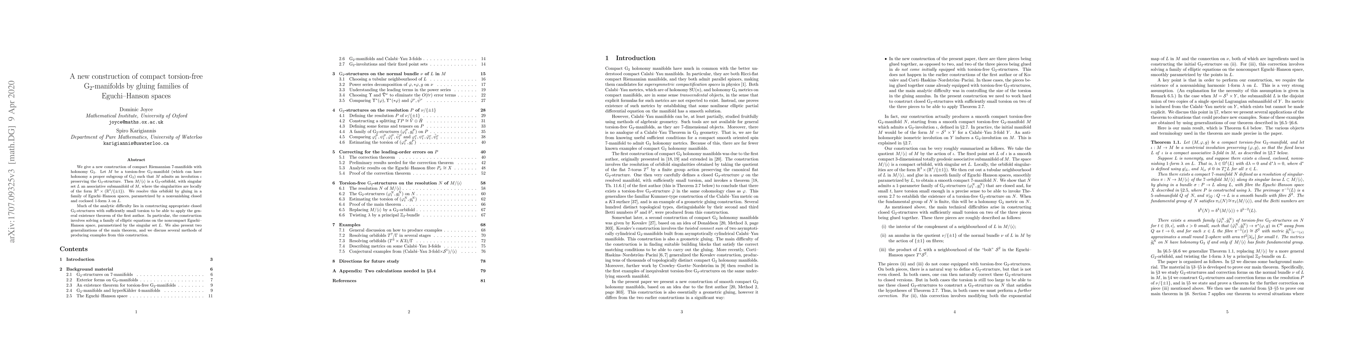 This paper presents a novel method to construct compact torsion-free $G_2$-manifolds by resolving orbifold singularities formed by gluing families of Eguchi-Hanson spaces, addressing the analytic challenges through the resolution of elliptic equations. The construction also includes generalizations and methods for producing examples.