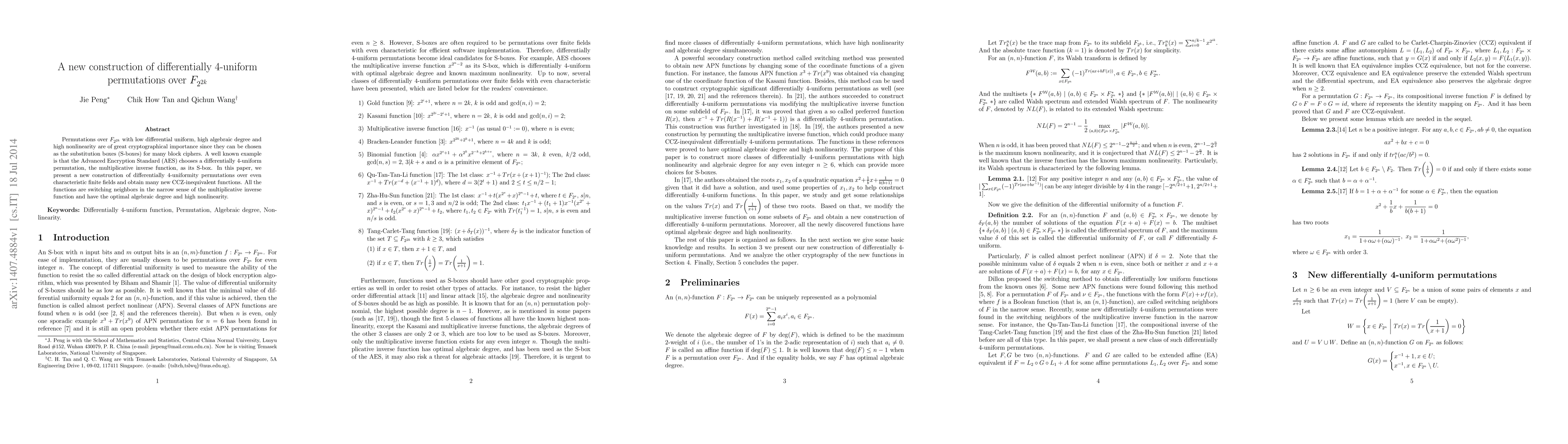 This paper presents a new construction of differentially 4-uniform permutations over finite fields of characteristic two, offering many new CCZ-inequivalent functions. These permutations are optimal in algebraic degree and high in nonlinearity, making them suitable for use as substitution boxes in block ciphers like AES.