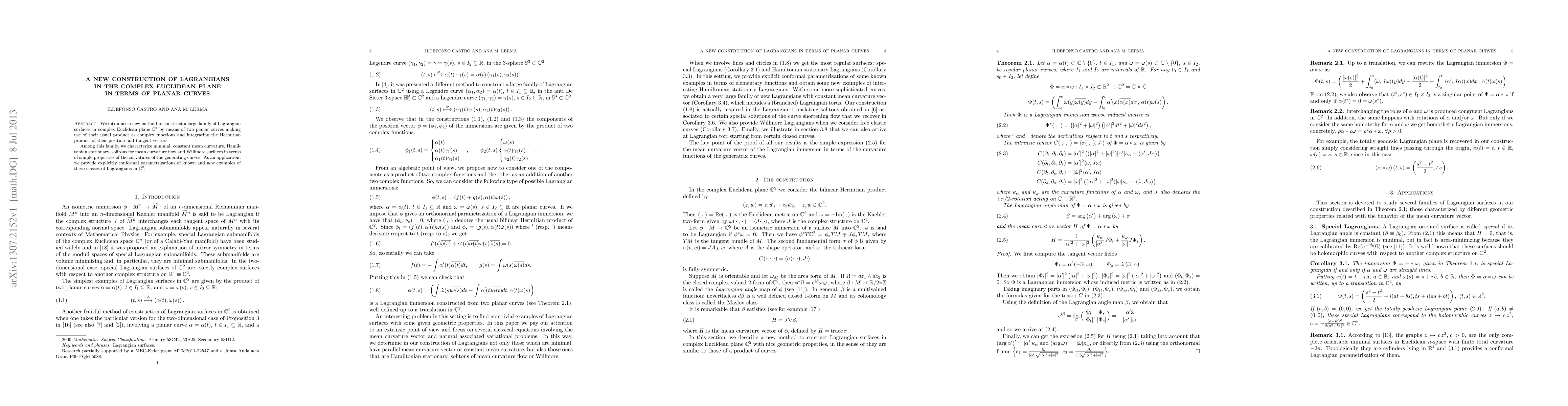 This paper presents a novel method to construct Lagrangian surfaces in the complex Euclidean plane using planar curves, integrating the Hermitian product of their position and tangent vectors. It characterizes various types of Lagrangians, including minimal and Willmore surfaces, based on the curvature properties of the generating curves, and provides explicit conformal parametrizations.