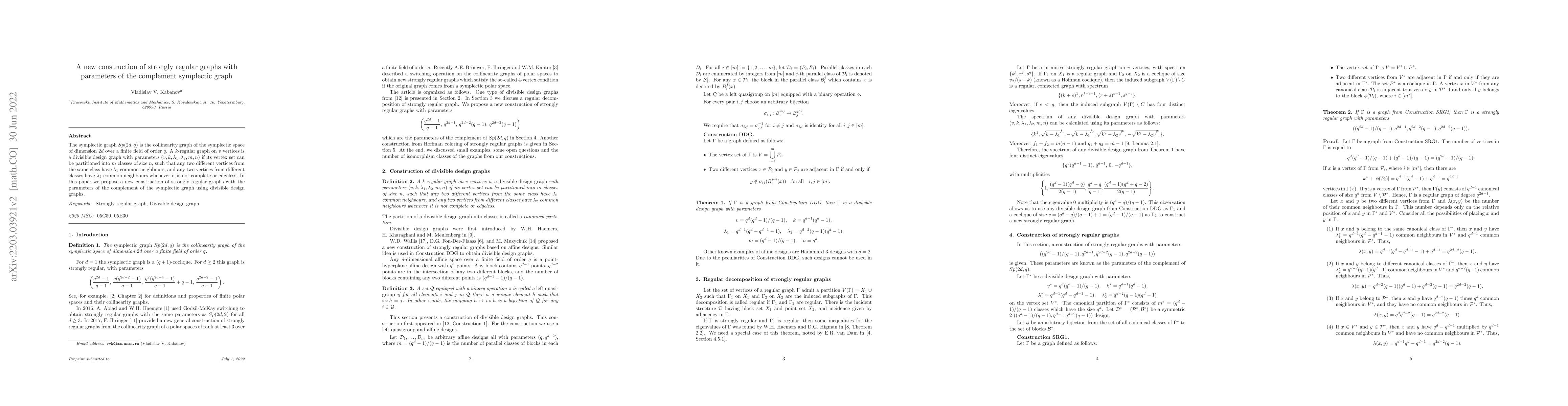 This paper introduces a novel construction of strongly regular graphs that match the parameters of the complement of the symplectic graph Sp(2d, q). It leverages divisible design graphs to achieve this construction, providing a new method for generating such graphs.