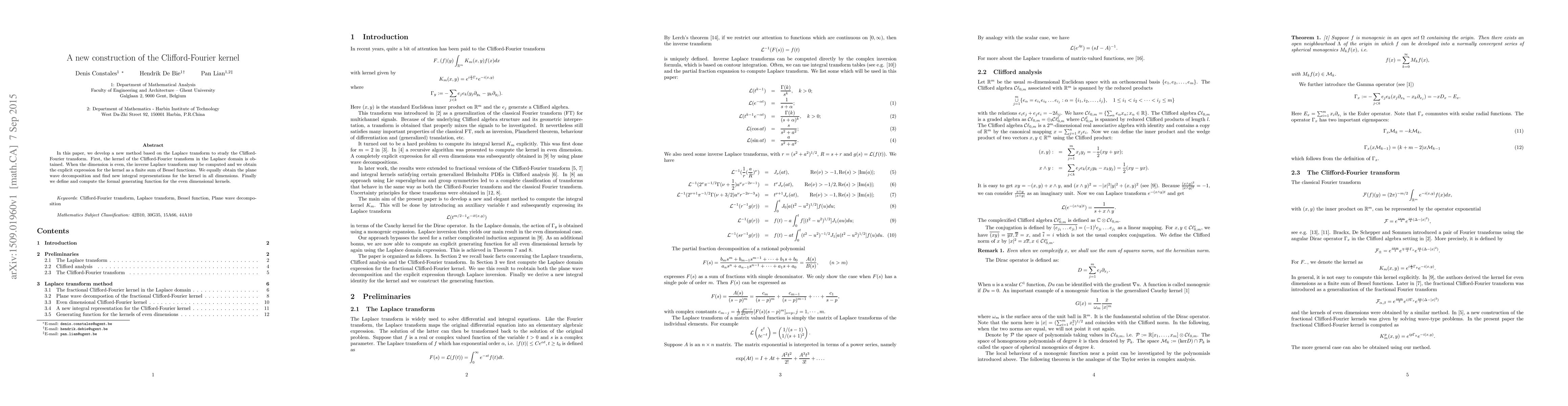 This paper introduces a novel method using Laplace transforms to study the Clifford-Fourier transform, deriving explicit expressions for the kernel as a finite sum of Bessel functions in even dimensions and new integral representations for all dimensions.