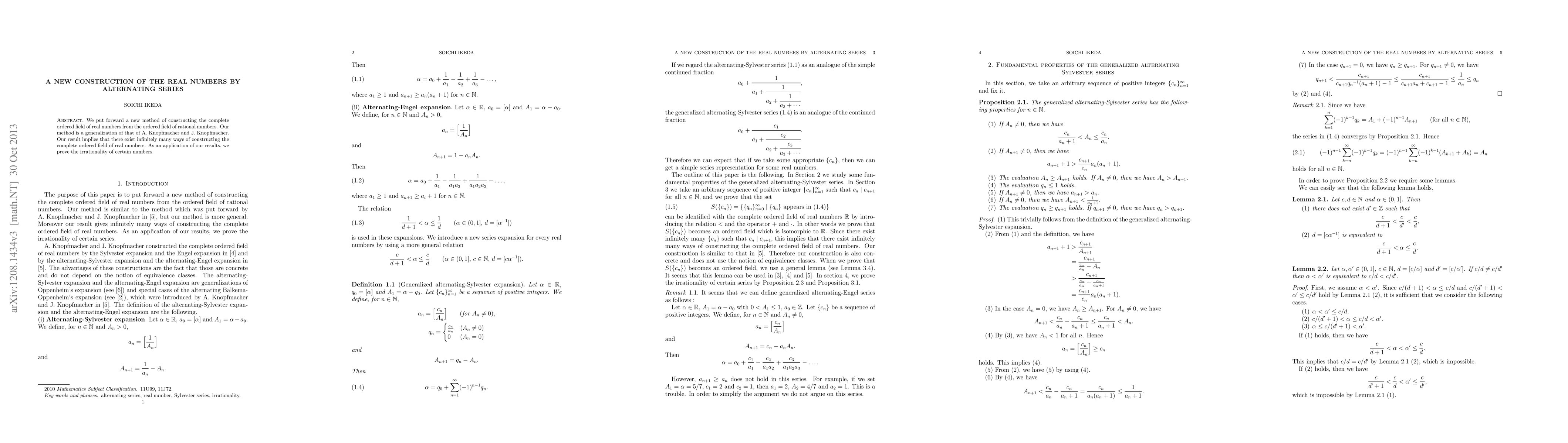 We put forward a new method of constructing the complete ordered field of real numbers from the ordered field of rational numbers. Our method is a generalization of that of A. Knopfmacher and J. Knopfmacher. Our result implies that there exist infinitely many ways of constructing the complete ordered field of real numbers. As an application of our results, we prove the irrationality of certain numbers.