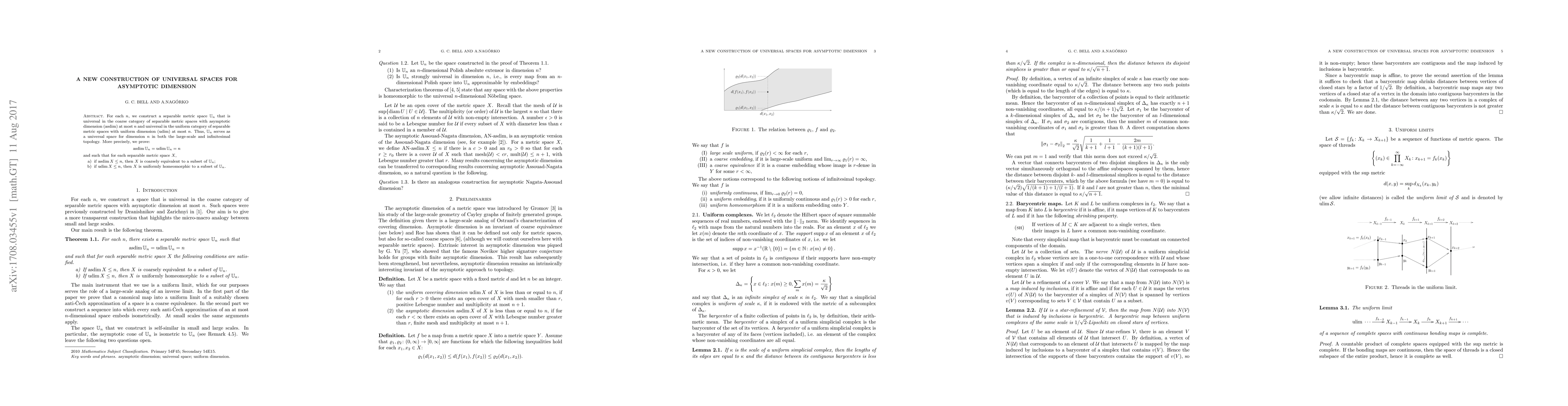 The paper presents the construction of separable metric spaces, $mathbb{U}_n$, universal for coarse and uniform categories of spaces with asymptotic dimension and uniform dimension up to $n$. It proves $mathop{asdim} mathbb{U}_n = mathop{udim} mathbb{U}_n = n$, ensuring each separable metric space $X$ with $mathop{asdim} X leq n$ or $mathop{udim} X leq n$ is coarsely or uniformly homeomorphic to a subset of $mathbb{U}_n$.