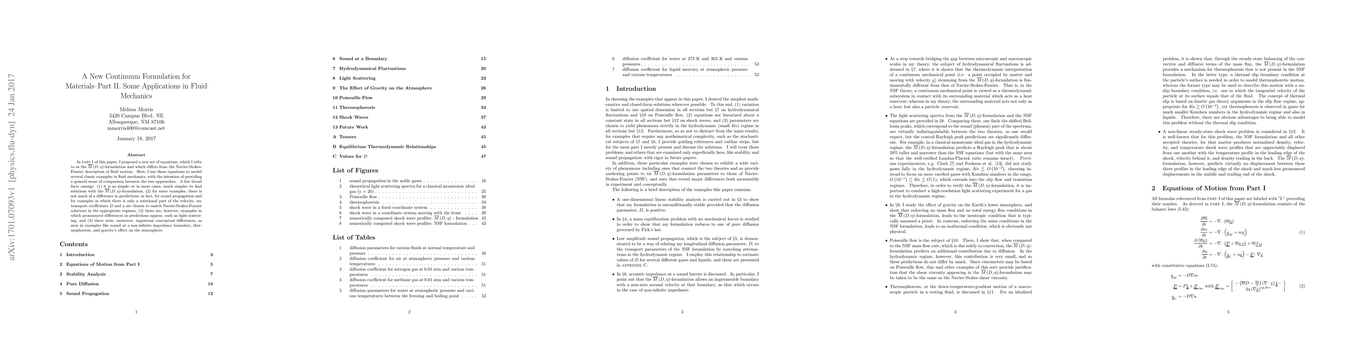 In part I of this paper, I proposed a new set of equations, which I refer to as the M(D,{\eta})-formulation and which differs from the Navier-Stokes-Fourier description of fluid motion. Here, I use these equations to model several classic examples in fluid mechanics, with the intention of providing a general sense of comparison between the two approaches. A few broad facts emerge: (1) it is as simple--or in most cases, much simpler--to find solutions with the M(D,{\eta})-formulation, (2) for some examples, there is not much of a difference in predictions--in fact, for sound propagation and for examples in which there is only a rotational part of the velocity, my transport coefficients D and {\eta} are chosen to match Navier-Stokes-Fourier solutions in the appropriate regimes, (3) there are, however, examples in which pronounced differences in predictions appear, such as light scattering, and (4) there arise, moreover, important conceptual differences, as seen in examples like sound at a non-infinite impedance boundary, thermophoresis, and gravity's effect on the atmosphere.