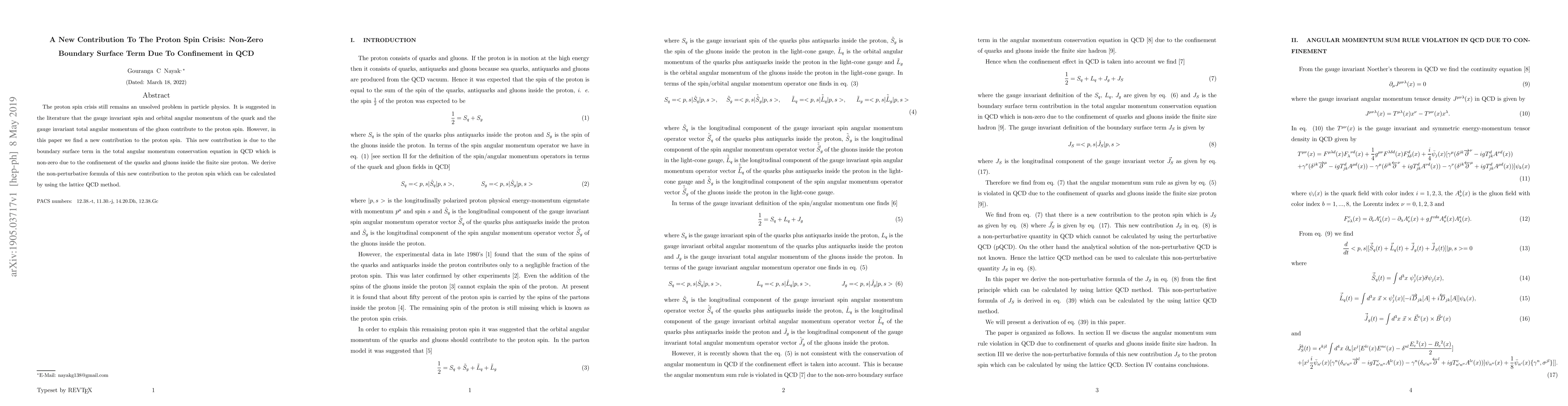 This paper proposes a novel contribution to the proton spin crisis, attributing it to a non-zero boundary surface term in the total angular momentum conservation equation in QCD, resulting from the confinement of quarks and gluons within the proton. The authors derive a non-perturbative formula for this contribution, which can be calculated using lattice QCD methods.