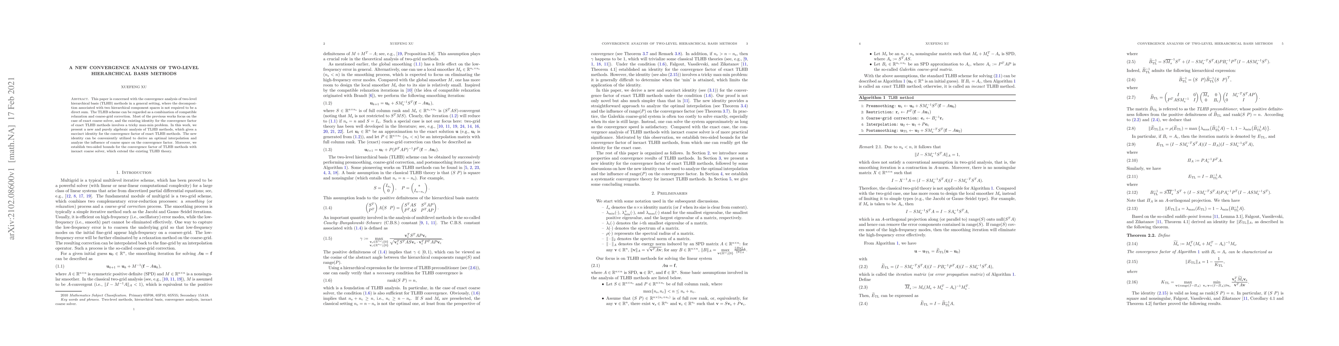 This paper is concerned with the convergence analysis of two-level hierarchical basis (TLHB) methods in a general setting, where the decomposition associated with two hierarchical component spaces is not required to be a direct sum. The TLHB scheme can be regarded as a combination of compatible relaxation and coarse-grid correction. Most of the previous works focus on the case of exact coarse solver, and the existing identity for the convergence factor of exact TLHB methods involves a tricky max-min problem. In this work, we present a new and purely algebraic analysis of TLHB methods, which gives a succinct identity for the convergence factor of exact TLHB methods. The new identity can be conveniently utilized to derive an optimal interpolation and analyze the influence of coarse space on the convergence factor. Moreover, we establish two-sided bounds for the convergence factor of TLHB methods with inexact coarse solver, which extend the existing TLHB theory.