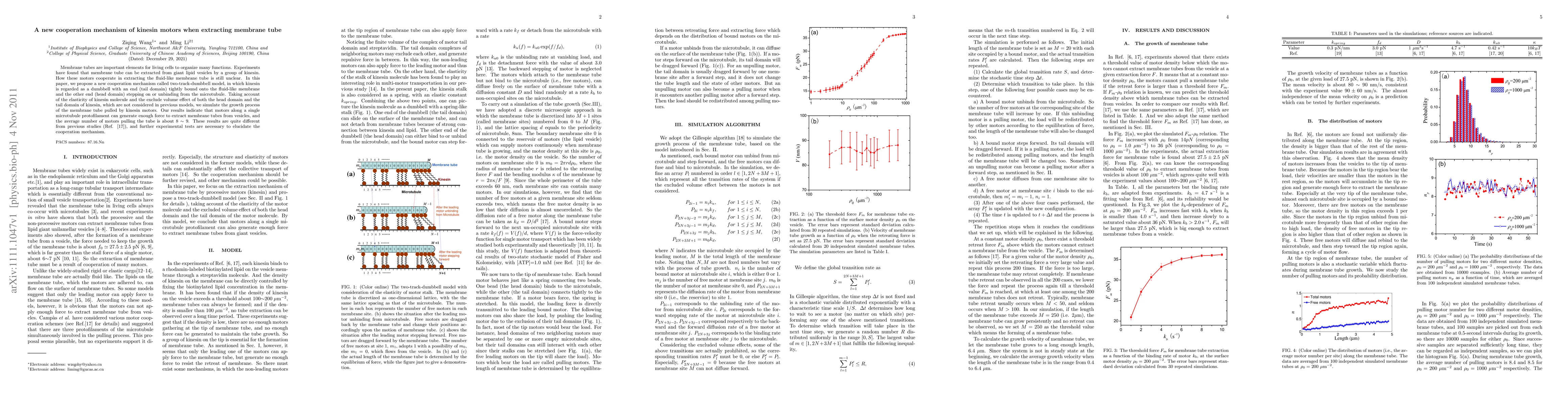This paper proposes a new cooperation mechanism for kinesin motors in extracting membrane tubes, termed the two-track-dumbbell model, considering kinesin elasticity and volume exclusion. Simulations suggest that 8~9 motors along a single microtubule protofilament can generate sufficient force, differing from previous studies and requiring experimental validation.