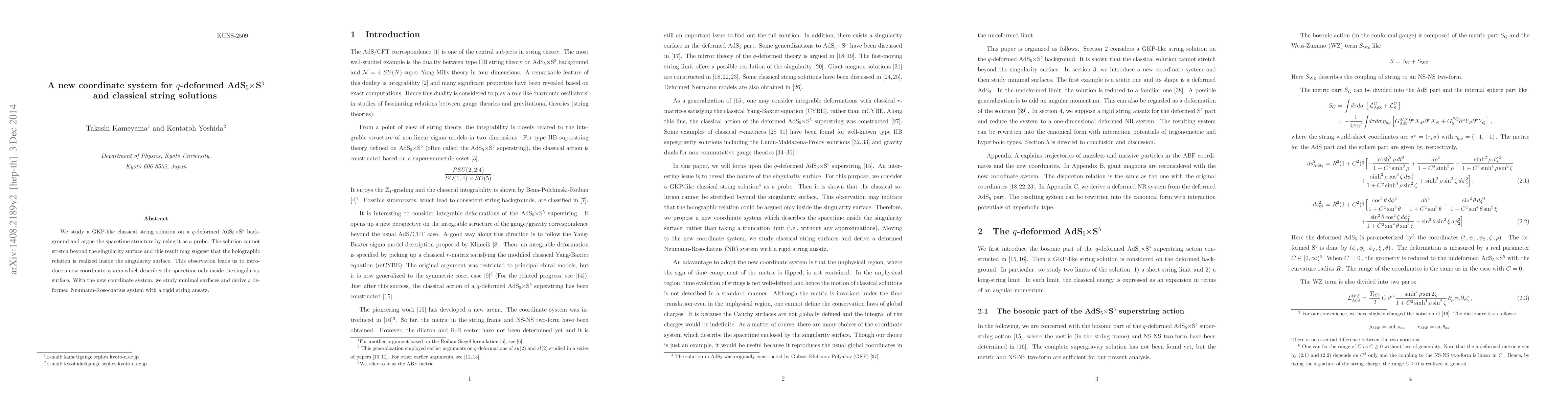 We study a GKP-like classical string solution on a q-deformed AdS_5 x S^5 background and argue the spacetime structure by using it as a probe. The solution cannot stretch beyond the singularity surface and this result may suggest that the holographic relation is realized inside the singularity surface. This observation leads us to introduce a new coordinate system which describes the spacetime only inside the singularity surface. With the new coordinate system, we study minimal surfaces and derive a deformed Neumann-Rosochatius system with a rigid string ansatz.
