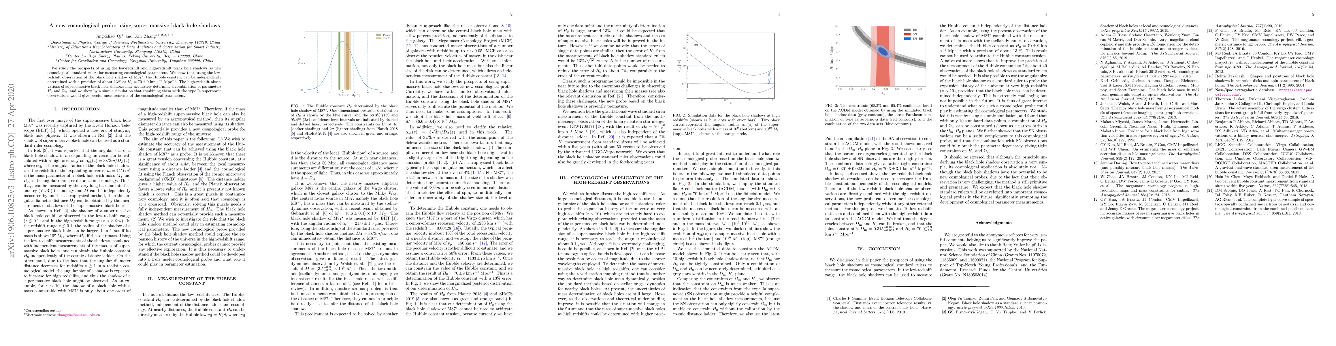 This paper explores the use of black hole shadows as novel cosmological probes, demonstrating that the low-redshift shadow of M87$^\star$ can determine the Hubble constant with 13% precision. High-redshift black hole shadows, combined with type Ia supernovae, may yield precise measurements of the Hubble constant and matter density parameter.