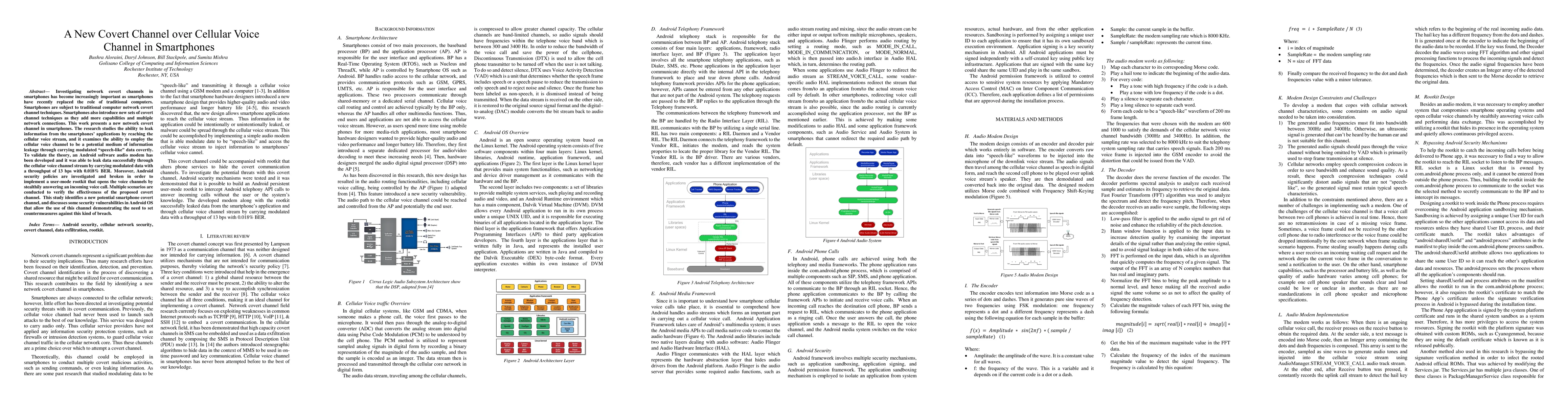 This research introduces a novel covert channel in smartphones using the cellular voice stream to leak information covertly. An Android audio modem was developed to demonstrate data transmission through modulated speech-like data, achieving 13 bps with minimal error, and exploiting Android security vulnerabilities to implement a stealthy user-mode rootkit.