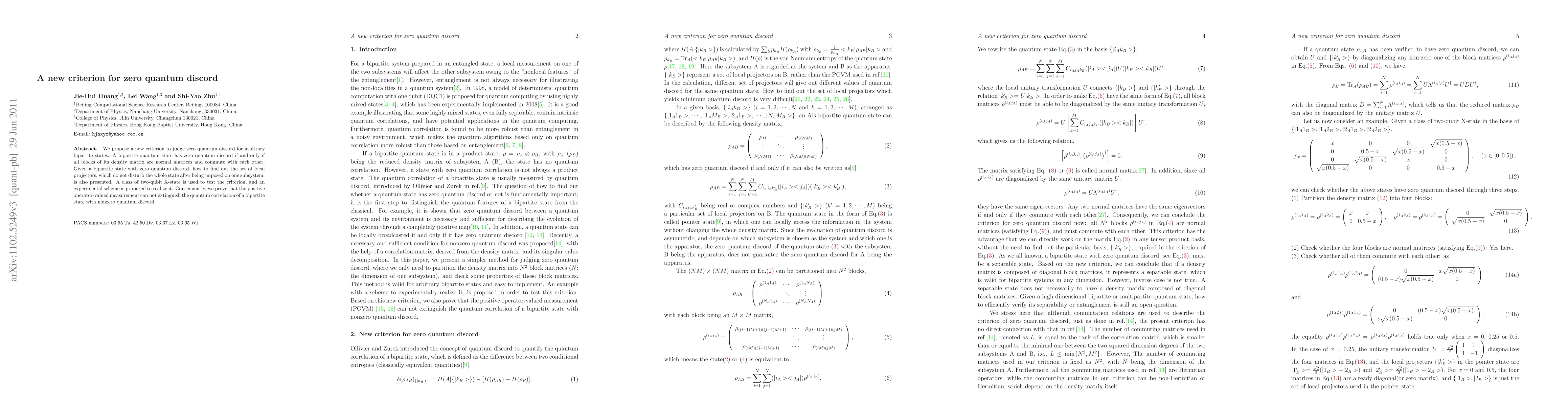 This paper introduces a new criterion for determining zero quantum discord in bipartite states, asserting that zero quantum discord exists if all blocks of the density matrix are normal and commute. It also outlines a method to identify non-disturbing local projectors for such states and tests the criterion on two-qubit X-states, proposing an experimental scheme to validate it.