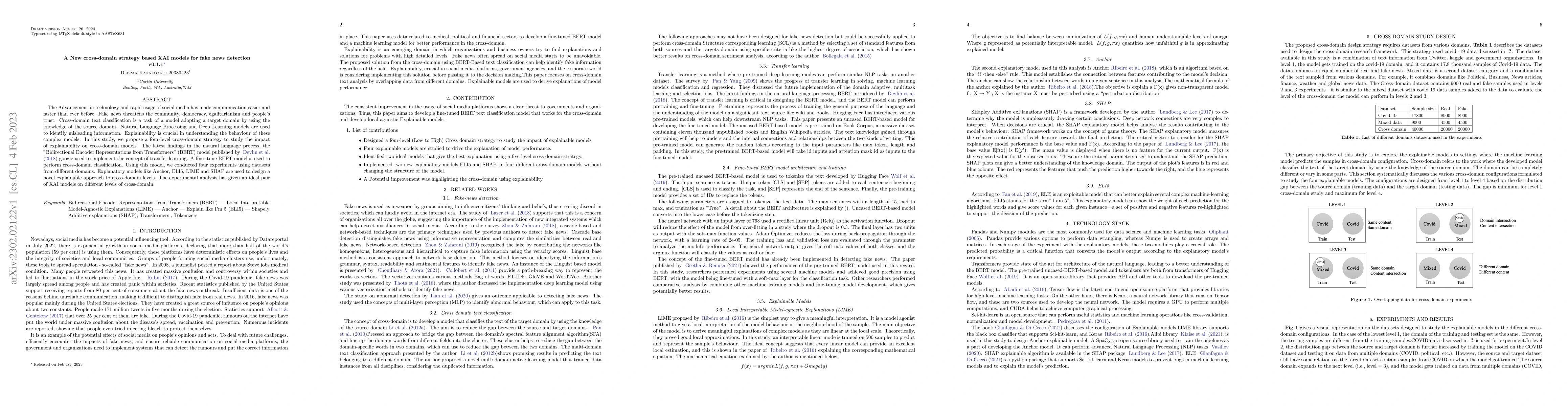 This study introduces a four-level cross-domain strategy for detecting fake news using fine-tuned BERT models, emphasizing the importance of explainability. It employs XAI models like Anchor, ELI5, LIME, and SHAP to enhance understanding of the model's behavior, achieving optimal performance across various datasets.