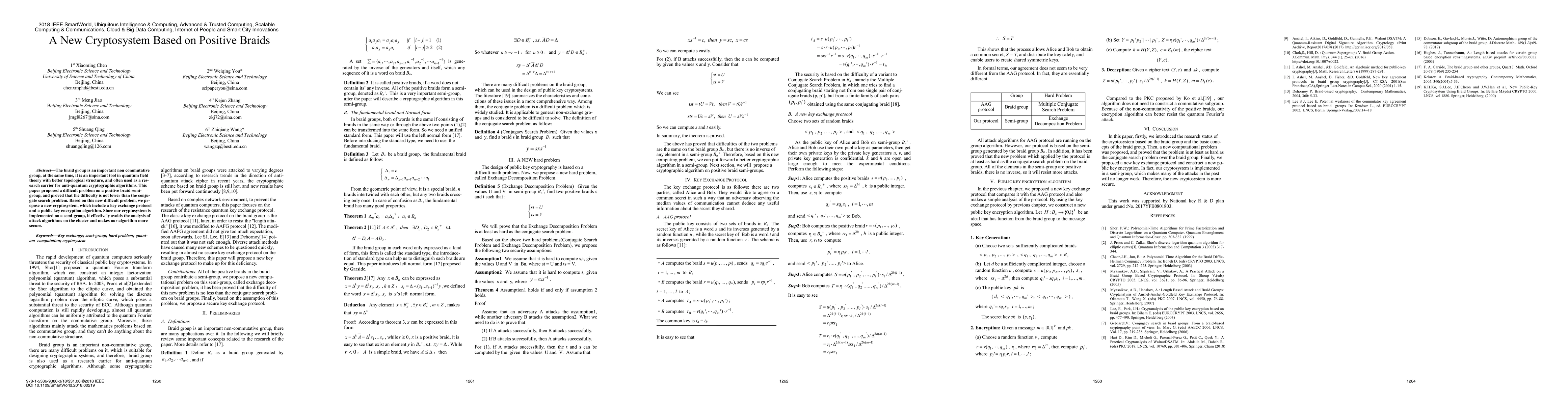 The braid group is an important non commutative group, at the same time, it is an important tool in quantum field theory with better topological structure, and often used as a research carrier for anti-quantum cryptographic algorithms. This paper proposed a difficult problem on a positive braid semi-group, and proved that the difficulty is not lower than the conjugate search problem. Based on this new difficult problem, we propose a new cryptosystem, which include a key exchange protocol and a public key encryption algorithm. Since our cryptosystem is implemented on a semi-group, it effectively avoids the analysis of attack algorithms on the cluster and makes our algorithm more secure.