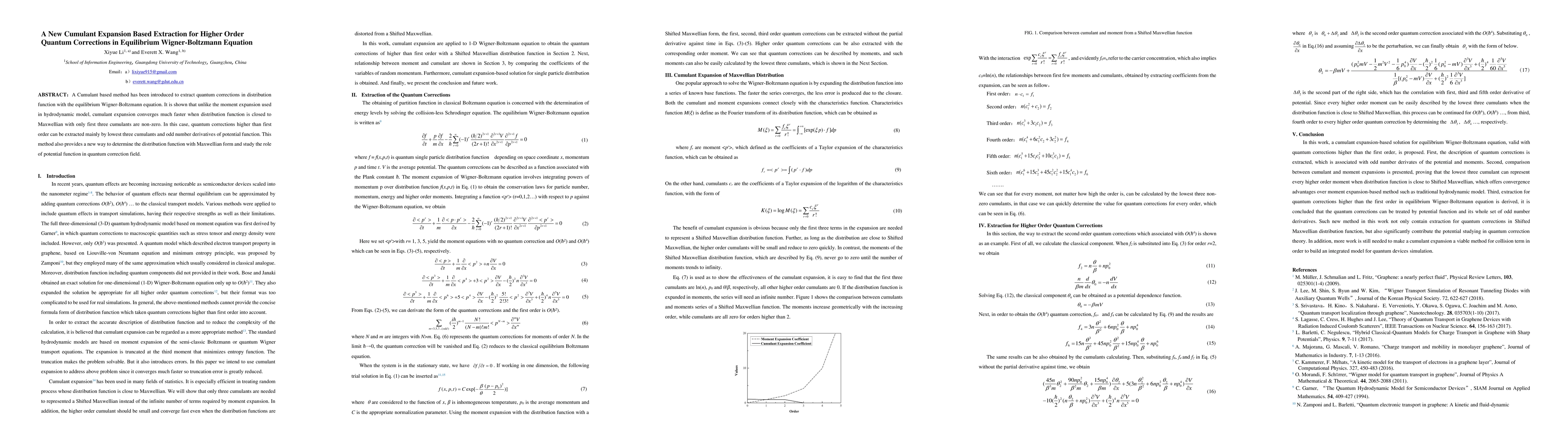 A Cumulant based method has been introduced to extract quantum corrections in distribution function with the equilibrium Wigner-Boltzmann equation. It is shown that unlike the moment expansion used in hydrodynamic model, cumulant expansion converges much faster when distribution function is closed to Maxwellian with only first three cumulants are non-zero. In this case, quantum corrections higher than first order can be extracted mainly by lowest three cumulants and odd number derivatives of potential function. This method also provides a new way to determine the distribution function with Maxwellian form and study the role of potential function in quantum correction field.