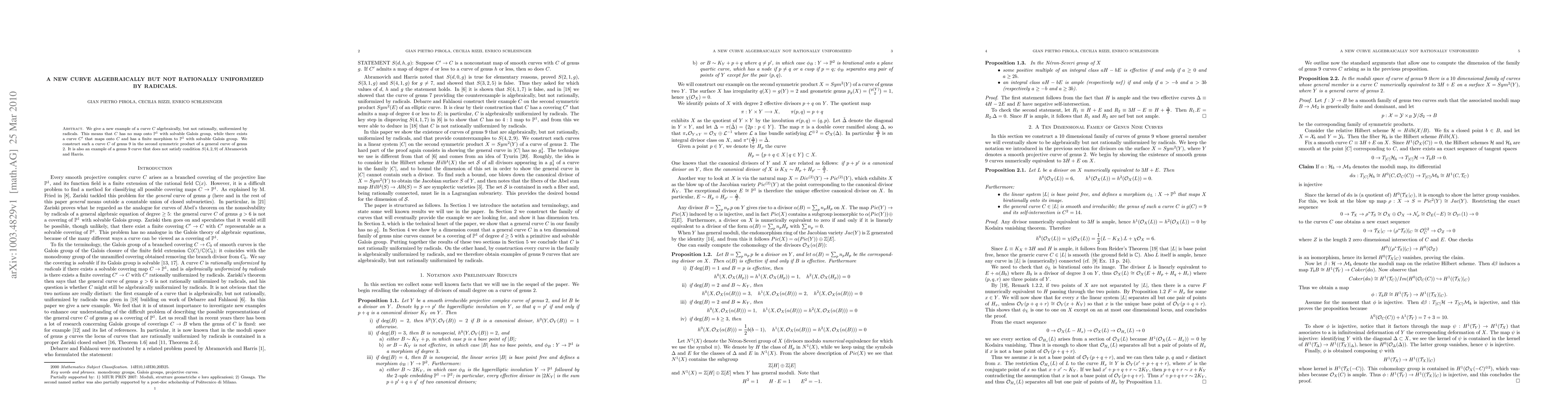 This paper presents a new genus 9 curve that is algebraically but not rationally uniformized by radicals, meaning it lacks a map to the projective line with a solvable Galois group, while a related curve C' has such a map. This curve also fails to satisfy Abramovich and Harris's condition S(4,2,9).