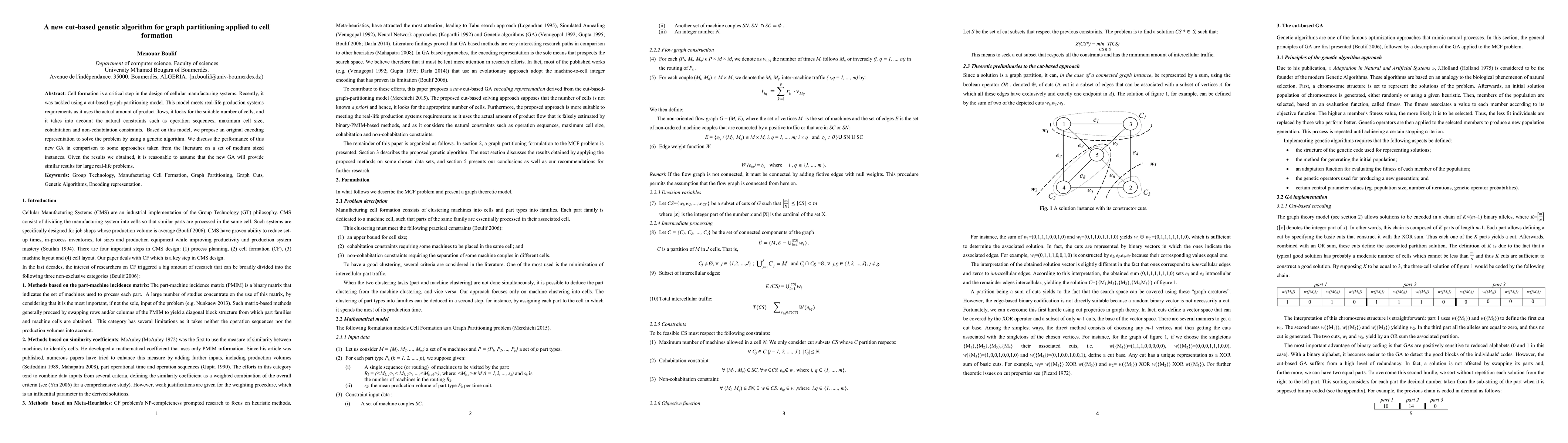 This paper proposes a novel cut-based genetic algorithm for solving the cell formation problem in cellular manufacturing systems, utilizing a graph partitioning model that considers product flows and operational constraints. The new genetic algorithm shows promising performance compared to existing methods, suggesting its effectiveness for large-scale real-life applications.