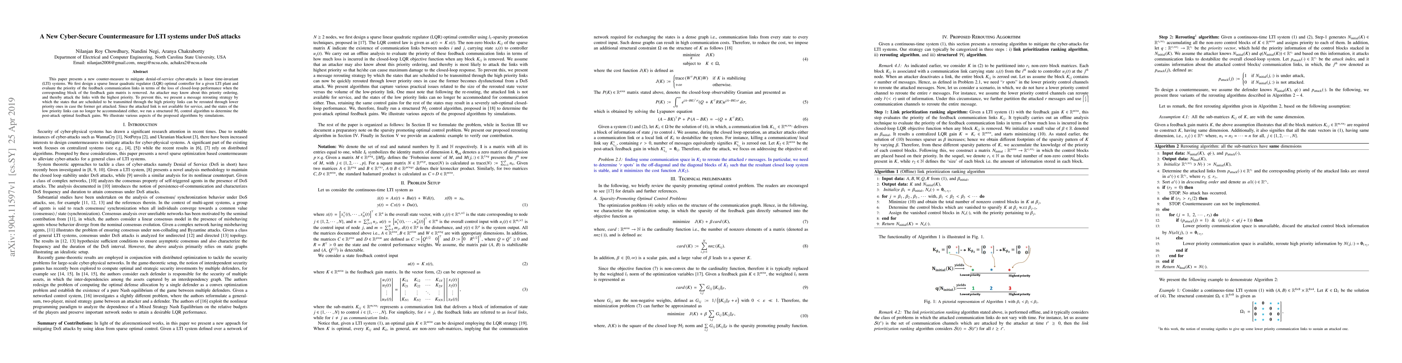 This paper presents a new counter-measure to mitigate denial-of-service cyber-attacks in linear time-invariant (LTI) systems. We first design a sparse linear quadratic regulator (LQR) optimal controller for a given LTI plant and evaluate the priority of the feedback communication links in terms of the loss of closed-loop performance when the corresponding block of the feedback gain matrix is removed. An attacker may know about this priority ordering, and thereby attack the links with the highest priority. To prevent this, we present a message rerouting strategy by which the states that are scheduled to be transmitted through the high priority links can be rerouted through lower priority ones in case the former get attacked. Since the attacked link is not available for service, and the states of the low priority links can no longer be accommodated either, we run a structured $\mathcal{H}_2$ control algorithm to determine the post-attack optimal feedback gains. We illustrate various aspects of the proposed algorithms by simulations.