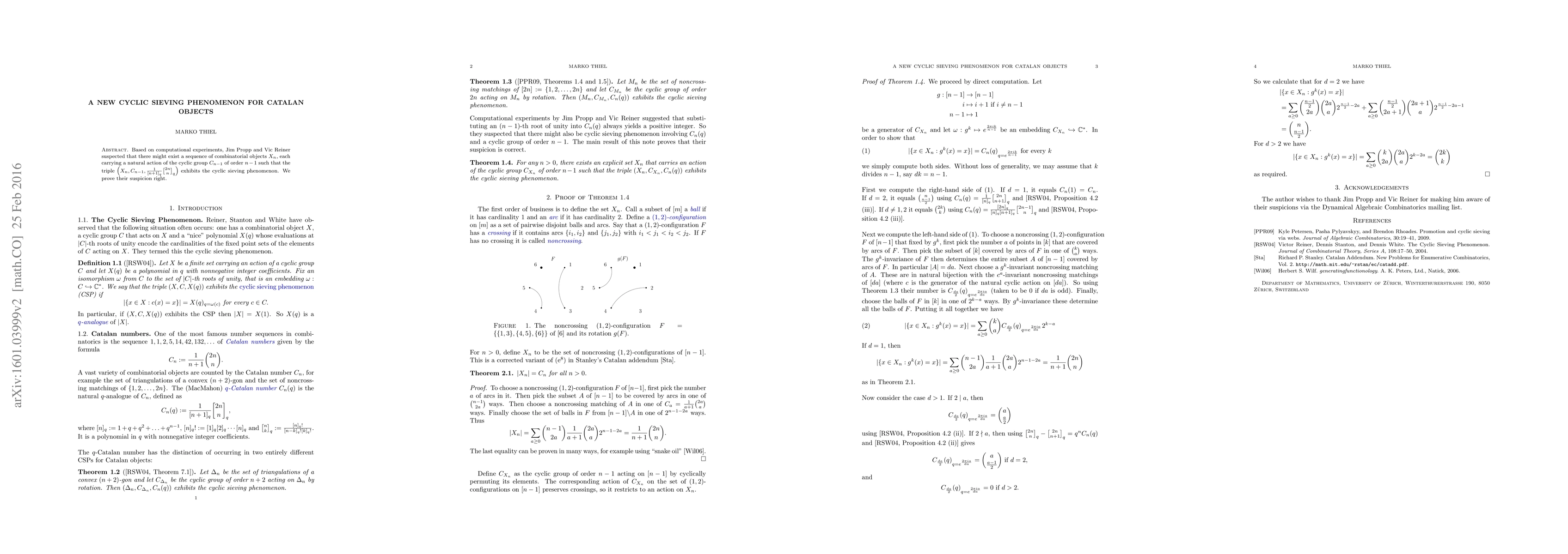 Researchers prove a new sequence of combinatorial objects exhibit cyclic sieving phenomenon with a specific triple involving a cyclic group and q-binomial coefficients. They suspect the existence of this phenomenon for Catalan objects based on computational experiments.
