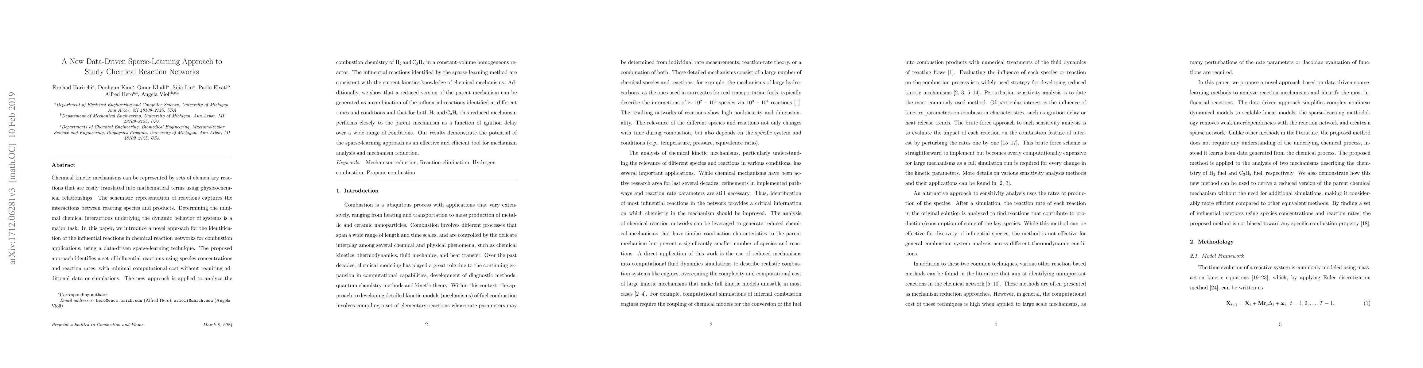 Chemical kinetic mechanisms can be represented by sets of elementary reactions that are easily translated into mathematical terms using physicochemical relationships. The schematic representation of reactions captures the interactions between reacting species and products. Determining the minimal chemical interactions underlying the dynamic behavior of systems is a major task. In this paper, we introduce a novel approach for the identification of the influential reactions in chemical reaction networks for combustion applications, using a data-driven sparse-learning technique. The proposed approach identifies a set of influential reactions using species concentrations and reaction rates, with minimal computational cost without requiring additional data or simulations. The new approach is applied to analyze the combustion chemistry of H2 and C3H8 in a constant-volume homogeneous reactor. The influential reactions identified by the sparse-learning method are consistent with the current kinetics knowledge of chemical mechanisms. Additionally, we show that a reduced version of the parent mechanism can be generated as a combination of the influential reactions identified at different times and conditions and that for both H2 and C3H8 this reduced mechanism performs closely to the parent mechanism as a function of ignition delay over a wide range of conditions. Our results demonstrate the potential of the sparse-learning approach as an effective and efficient tool for mechanism analysis and mechanism reduction.