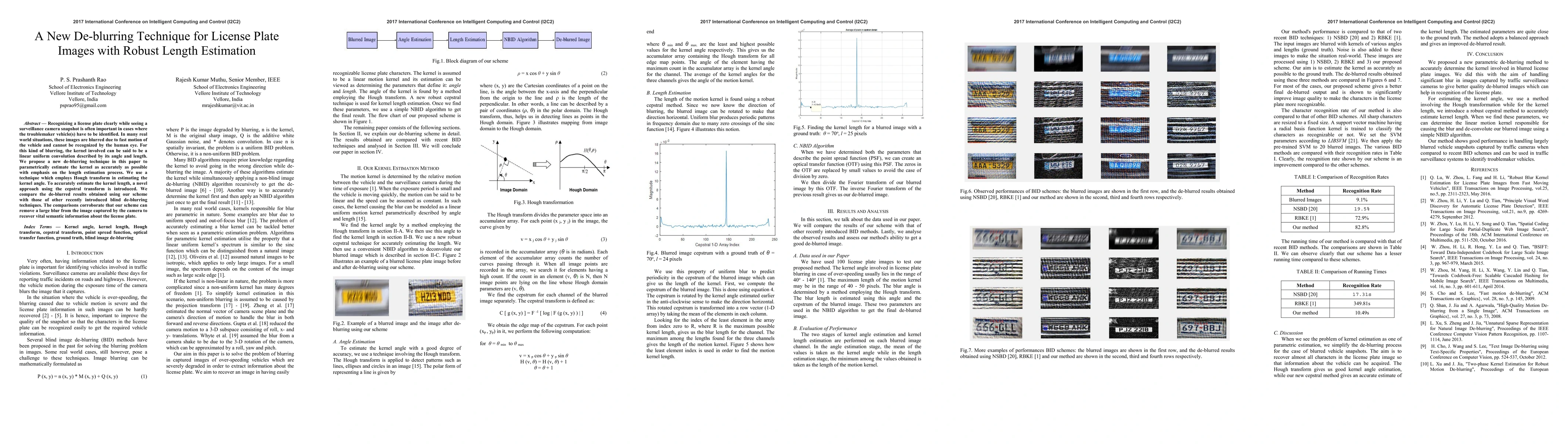 This paper proposes a new de-blurring technique for recognizing license plates in blurred surveillance images, employing Hough transform for kernel angle estimation and cepstral transform for length estimation. Comparative results show superior performance in recovering vital semantic information compared to other de-blurring methods.