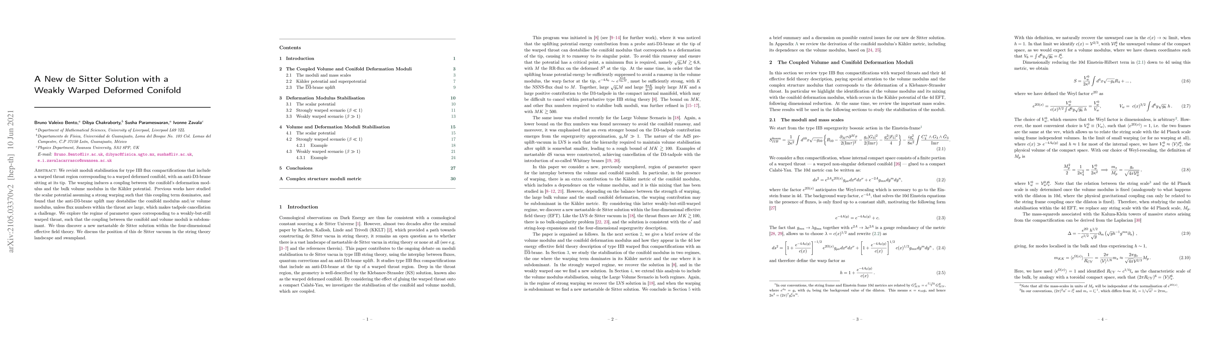 This paper presents a new metastable de Sitter solution in type IIB flux compactifications with a weakly warped deformed conifold throat. It explores parameter regimes where the coupling between conifold and volume moduli is subdominant, avoiding destabilization issues.