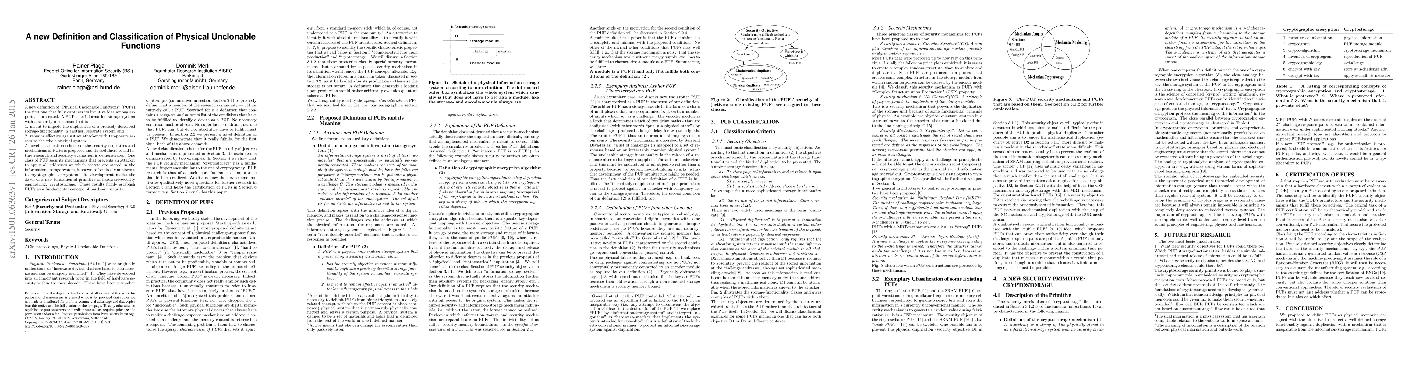 This paper introduces a comprehensive definition of Physical Unclonable Functions (PUFs) that captures their security essence and proposes a new classification scheme for their security mechanisms. It highlights a class of PUFs analogous to cryptographic encryption, marking the emergence of a new hardware-security primitive called cryptostorage.