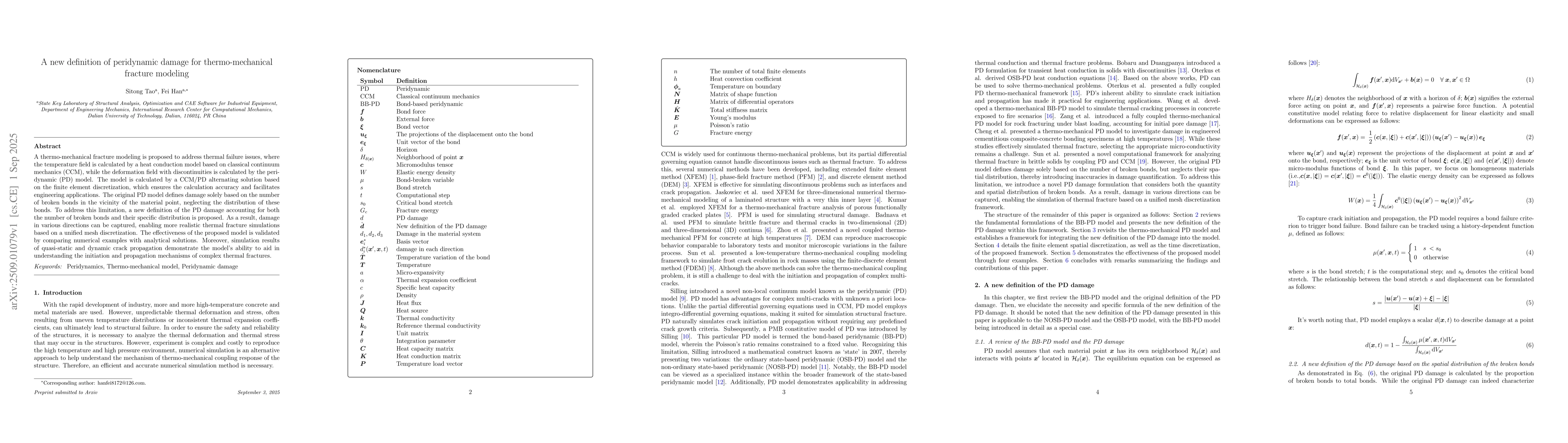 A thermo-mechanical fracture modeling is proposed to address thermal failure issues, where the temperature field is calculated by a heat conduction model based on classical continuum mechanics (CCM), while the deformation field with discontinuities is calculated by the peridynamic (PD) model. The model is calculated by a CCM/PD alternating solution based on the finite element discretization, which ensures the calculation accuracy and facilitates engineering applications. The original PD model defines damage solely based on the number of broken bonds in the vicinity of the material point, neglecting the distribution of these bonds. To address this limitation, a new definition of the PD damage accounting for both the number of broken bonds and their specific distribution is proposed. As a result, damage in various directions can be captured, enabling more realistic thermal fracture simulations based on a unified mesh discretization. The effectiveness of the proposed model is validated by comparing numerical examples with analytical solutions. Moreover, simulation results of quasi-static and dynamic crack propagation demonstrate the model's ability to aid in understanding the initiation and propagation mechanisms of complex thermal fractures.