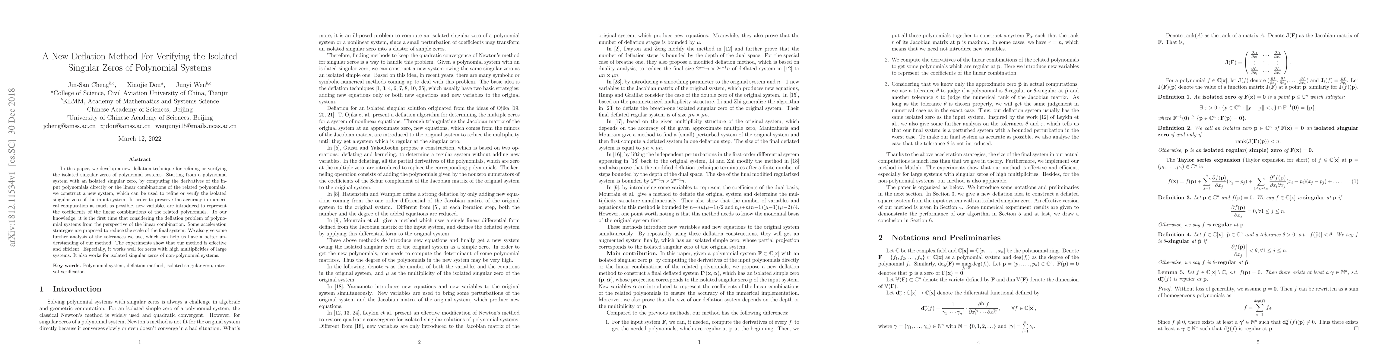 This paper introduces a novel deflation method to refine or verify isolated singular zeros in polynomial systems by constructing a new system from linear combinations of related polynomials. The method introduces new variables to maintain numerical accuracy and includes strategies to reduce computational scale, demonstrating effectiveness for high multiplicity zeros in large systems.