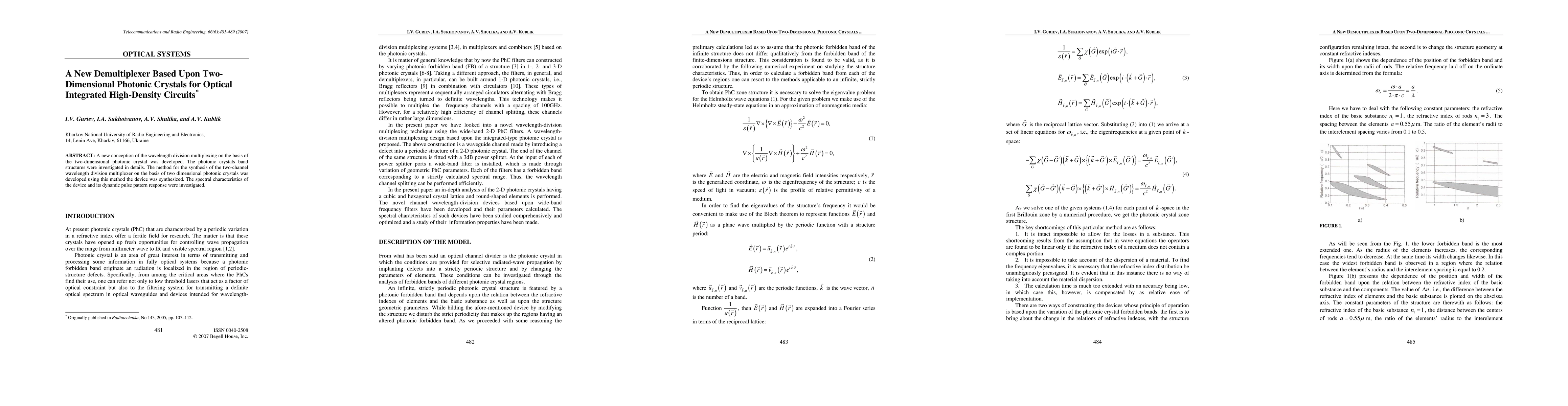 This paper introduces a novel two-dimensional photonic crystal-based demultiplexer for high-density optical circuits, detailing its synthesis and evaluating its spectral characteristics and dynamic pulse response. The study focuses on the photonic crystal's band structure and the effectiveness of the proposed wavelength division multiplexing method.