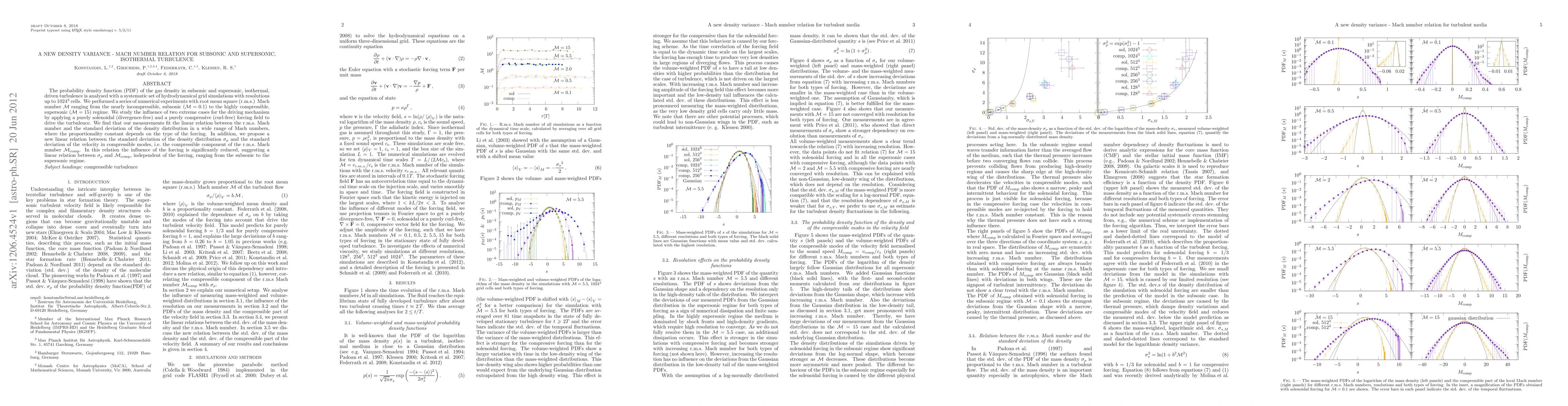 This paper analyzes the probability density function of gas density in subsonic and supersonic turbulence through high-resolution simulations, finding a linear relation between the root mean square Mach number and the standard deviation of density. It proposes a new relation between the standard deviation of density and the compressible component of velocity, independent of the driving mechanism.