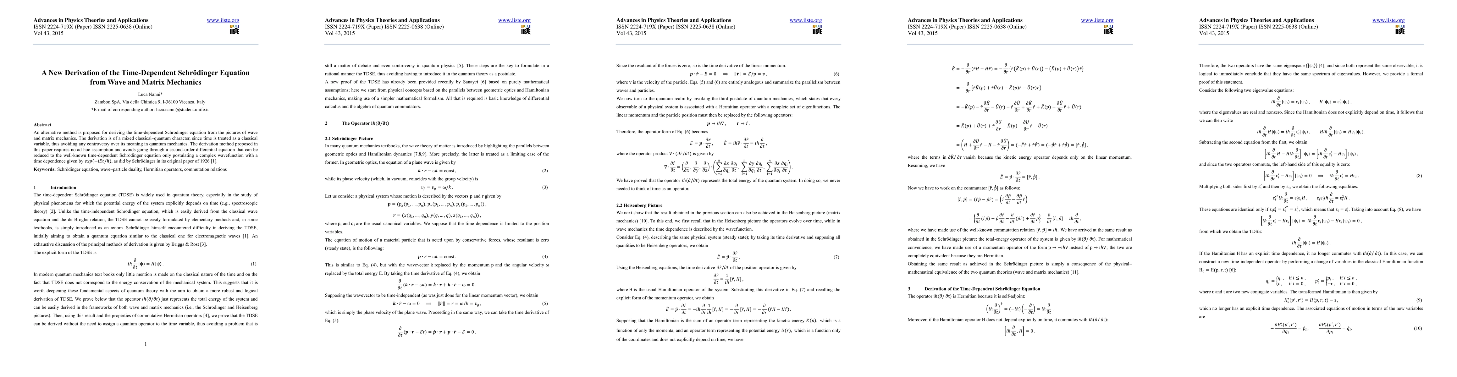 Researchers propose an alternative method to derive the time-dependent Schrödinger equation from wave and matrix mechanics without assuming a complex wavefunction with exponential time dependence. The derivation treats time as a classical variable, avoiding controversies in quantum mechanics.