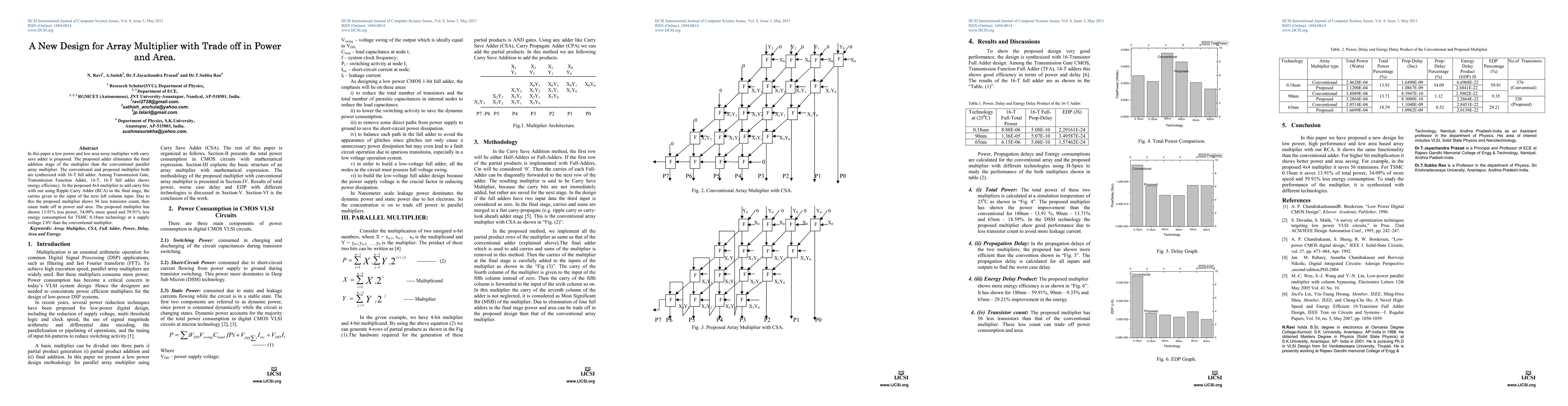 In this paper a low power and low area array multiplier with carry save adder is proposed. The proposed adder eliminates the final addition stage of the multiplier than the conventional parallel array multiplier. The conventional and proposed multiplier both are synthesized with 16-T full adder. Among Transmission Gate, Transmission Function Adder, 14-T, 16-T full adder shows energy efficiency. In the proposed 4x4 multiplier to add carry bits with out using Ripple Carry Adder (RCA) in the final stage, the carries given to the input of the next left column input. Due to this the proposed multiplier shows 56 less transistor count, then cause trade off in power and area. The proposed multiplier has shown 13.91% less power, 34.09% more speed and 59.91% less energy consumption for TSMC 0.18nm technology at a supply voltage 2.0V than the conventional multiplier.