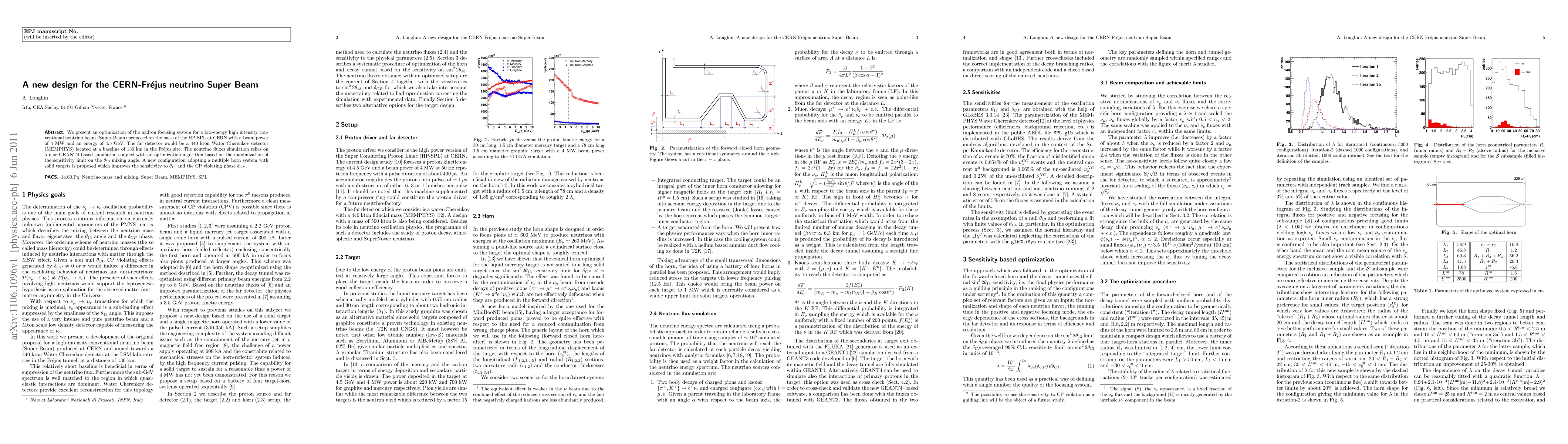 This paper optimizes the CERN-Fr\'ejus neutrino Super Beam design, focusing on a low-energy, high-intensity beam with 4 MW power and 4.5 GeV energy. A new GEANT4-based simulation and optimization algorithm enhance sensitivity to the $\theta_{13}$ mixing angle and CP violating phase $\delta_{CP}$, proposing a multiple horn system with solid targets for improved detection.