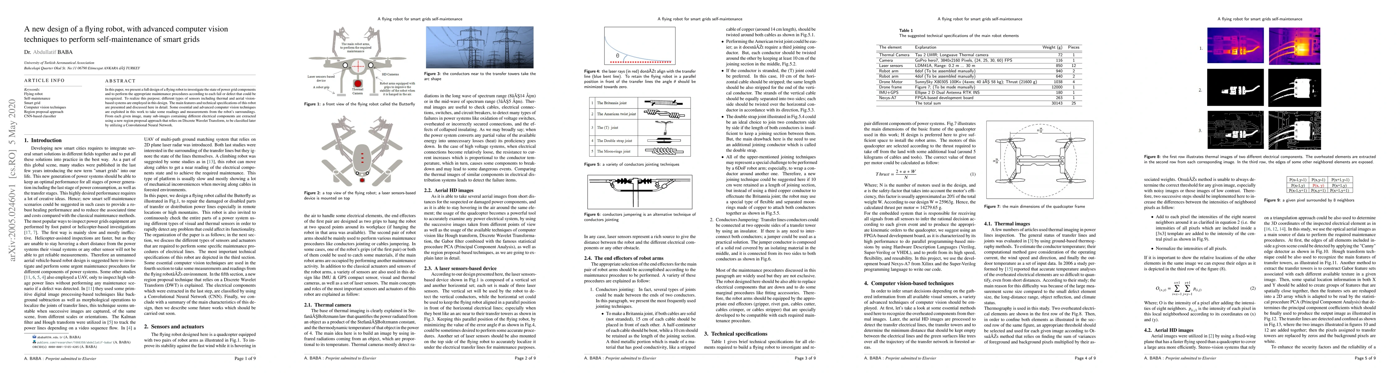 In this paper, we present a full design of a flying robot to investigate the state of power grid components and to perform the appropriate maintenance procedures according to each fail or defect that could be recognized. To realize this purpose; different types of sensors including thermal and aerial vision-based systems are employed in this design. The main features and technical specifications of this robot are presented and discussed here in detail. Some essential and advanced computer vision techniques are exploited in this work to take some readings and measurements from the robot's surroundings. From each given image, many sub-images containing different electrical components are extracted using a new region proposal approach that relies on Discrete Wavelet Transform, to be classified later by utilizing a Convolutional Neural Network.