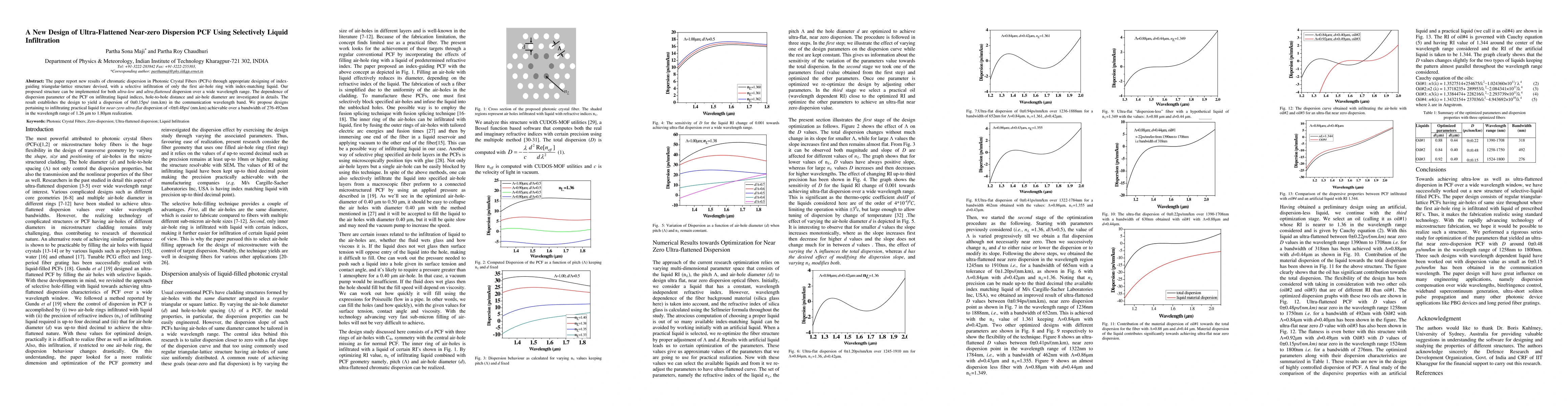 This paper presents a novel design of ultra-flattened near-zero dispersion Photonic Crystal Fiber (PCF) by selectively infiltrating the first air-hole ring with index-matching liquid, achieving dispersion values of 0±0.15ps/(nm.km) in the communication band, and near-zero ultra-flat dispersion of D=0±0.48ps/(nm.km) over a 276-492nm bandwidth.
