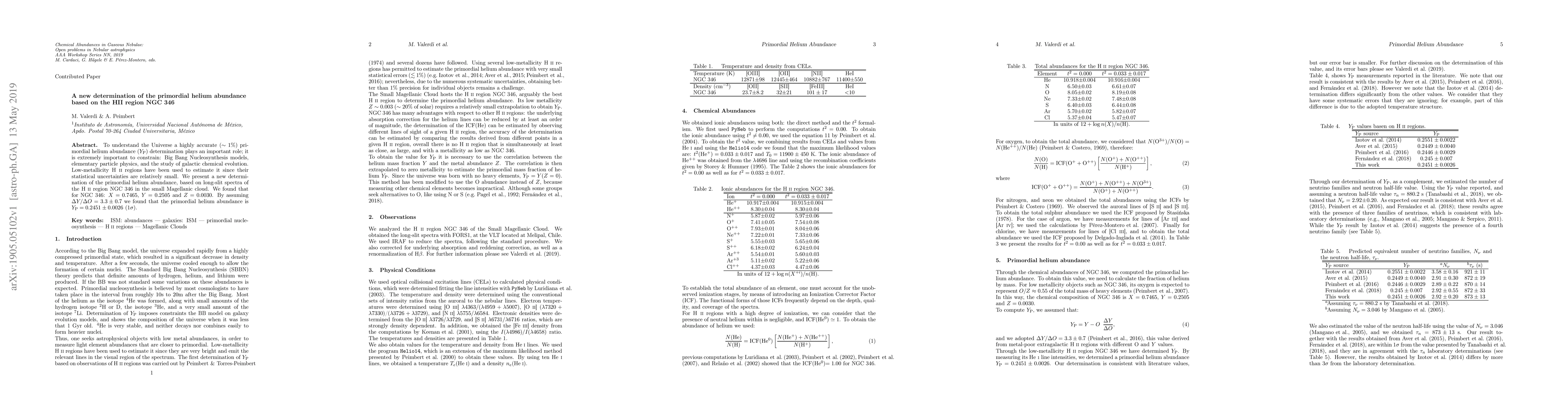 To understand the Universe a highly accurate ($\sim$1%) primordial helium abundance (Yp) determination plays an important role; it is extremely important to constrain: Big Bang Nucleosynthesis models, elementary particle physics, and the study of galactic chemical evolution. Low-metallicity HII regions have been used to estimate it since their statistical uncertainties are relatively small. We present a new determination of the primordial helium abundance, based on long-slit spectra of the HII region NGC 346 in the small Magellanic cloud. We found that for NGC 346: X=0.7465, Y=0.2505, and Z=0.0030. By assuming $\Delta$Y/$\Delta$O = 3.3$\pm$0.7 we found that the primordial helium abundance is Yp= 0.2451$\pm$.0026 (1$\sigma$).