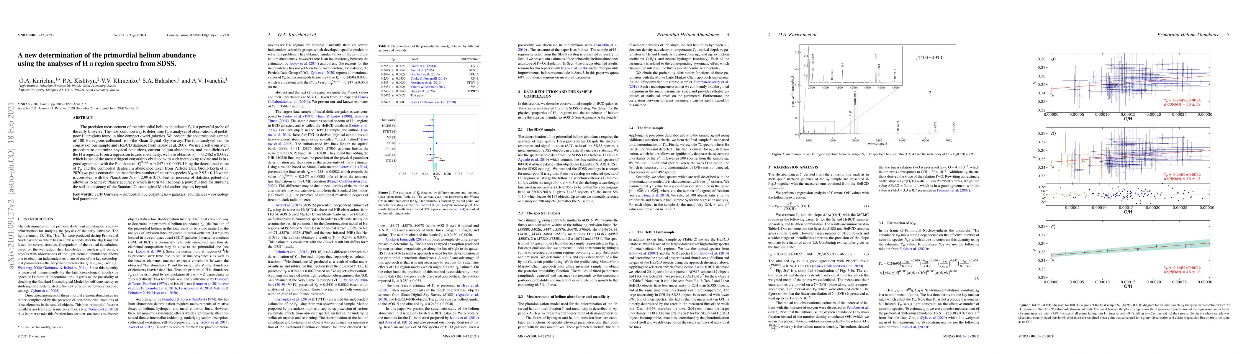 This study determines the primordial helium abundance ($Y_p$) using 100 HII region spectra from the Sloan Digital Sky Survey, combined with the HeBCD database. The result, $Y_p = 0.2462 pm 0.0022$, aligns with the Planck value. Using this $Y_p$ and deuterium abundance data, the researchers also constrain the effective number of neutrino species ($N_{ m eff}$) to 2.95 pm 0.16, consistent with Planck's result. This methodology suggests potential for reaching Planck's accuracy with increased statistics, aiding in cosmological model testing.