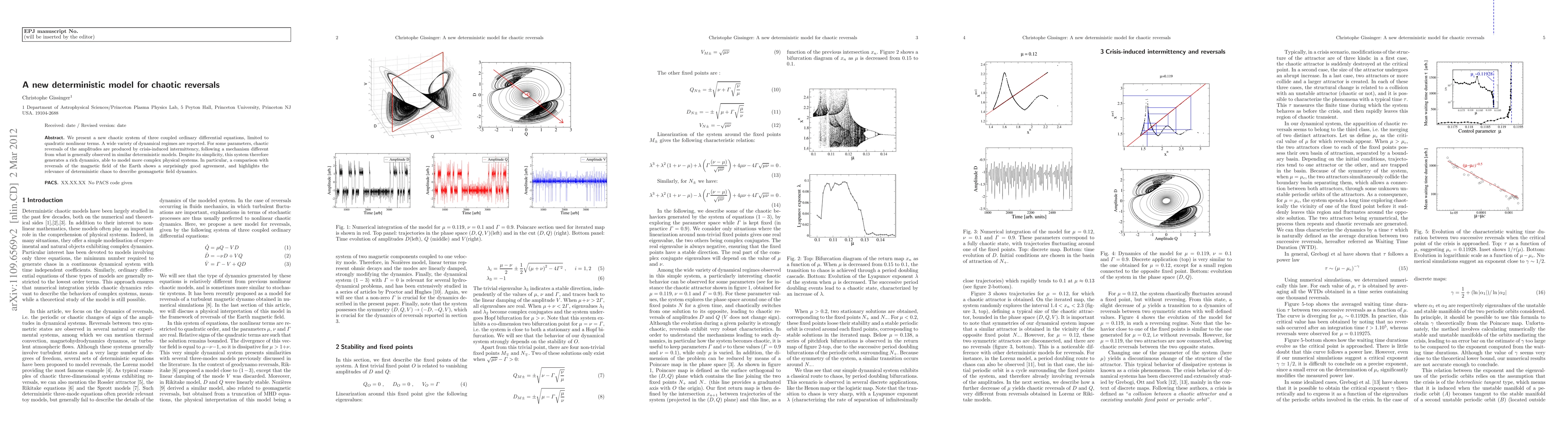 We present a new chaotic system of three coupled ordinary differential equations, limited to quadratic nonlinear terms. A wide variety of dynamical regimes are reported. For some parameters, chaotic reversals of the amplitudes are produced by crisis-induced intermittency, following a mechanism different from what is generally observed in similar deterministic models. Despite its simplicity, this system therefore generates a rich dynamics, able to model more complex physical systems. In particular, a comparison with reversals of the magnetic field of the Earth shows a surprisingly good agreement, and highlights the relevance of deterministic chaos to describe geomagnetic field dynamics.