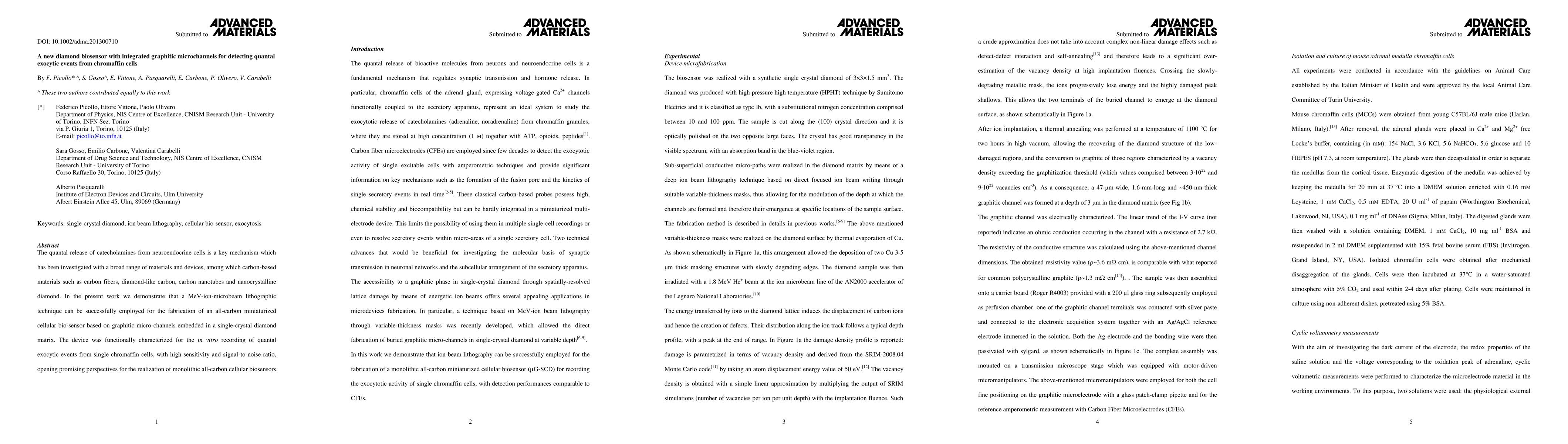 This paper presents a novel diamond biosensor with integrated graphitic microchannels, fabricated using MeV-ion-microbeam lithography, for detecting quantal exocytic events from chromaffin cells with high sensitivity and signal-to-noise ratio. The device shows promising potential for future monolithic all-carbon cellular biosensors.