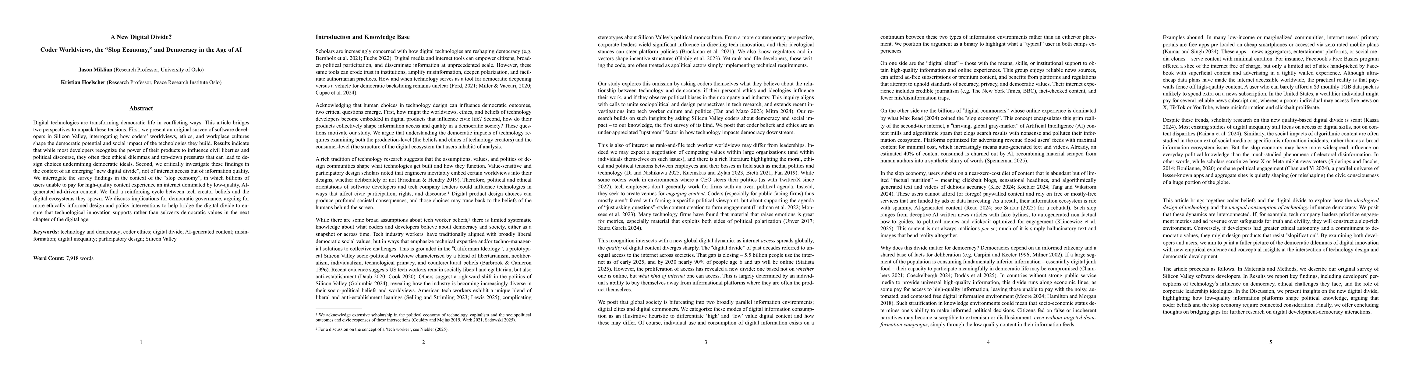 Digital technologies are transforming democratic life in conflicting ways. This article bridges two perspectives to unpack these tensions. First, we present an original survey of software developers in Silicon Valley, interrogating how coder worldviews, ethics, and workplace cultures shape the democratic potential and social impact of the technologies they build. Results indicate that while most developers recognize the power of their products to influence civil liberties and political discourse, they often face ethical dilemmas and top-down pressures that can lead to design choices undermining democratic ideals. Second, we critically investigate these findings in the context of an emerging new digital divide, not of internet access but of information quality. We interrogate the survey findings in the context of the Slop Economy, in which billions of users unable to pay for high-quality content experience an internet dominated by low-quality, AI-generated ad-driven content. We find a reinforcing cycle between tech creator beliefs and the digital ecosystems they spawn. We discuss implications for democratic governance, arguing for more ethically informed design and policy interventions to help bridge the digital divide to ensure that technological innovation supports rather than subverts democratic values in the next chapter of the digital age.