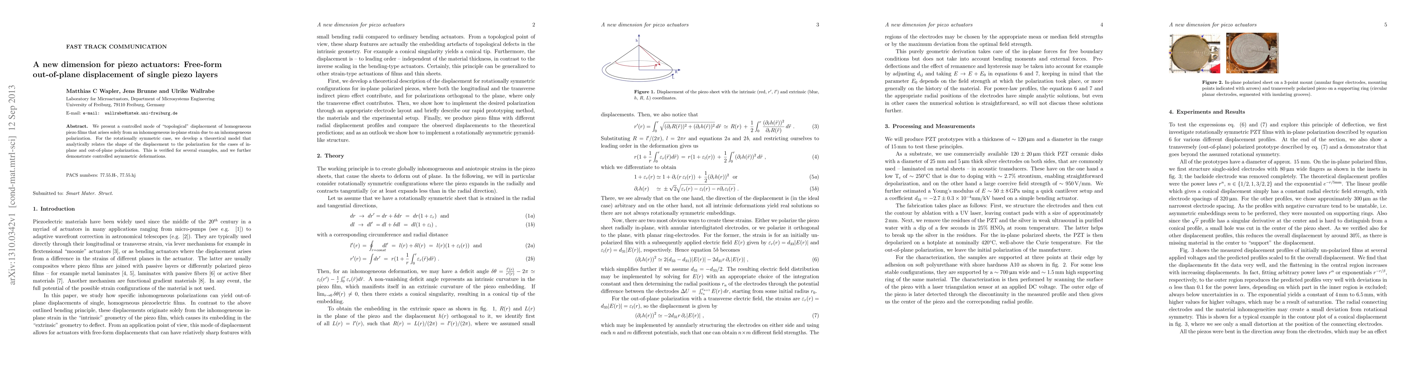 We present a controlled mode of "topological" displacement of homogeneous piezo films that arises solely from an inhomogeneous in-plane strain due to an inhomogeneous polarization. For the rotationally symmetric case, we develop a theoretical model that analytically relates the shape of the displacement to the polarization for the cases of in-plane and out-of-plane polarization. This is verified for several examples, and we further demonstrate controlled asymmetric deformations.