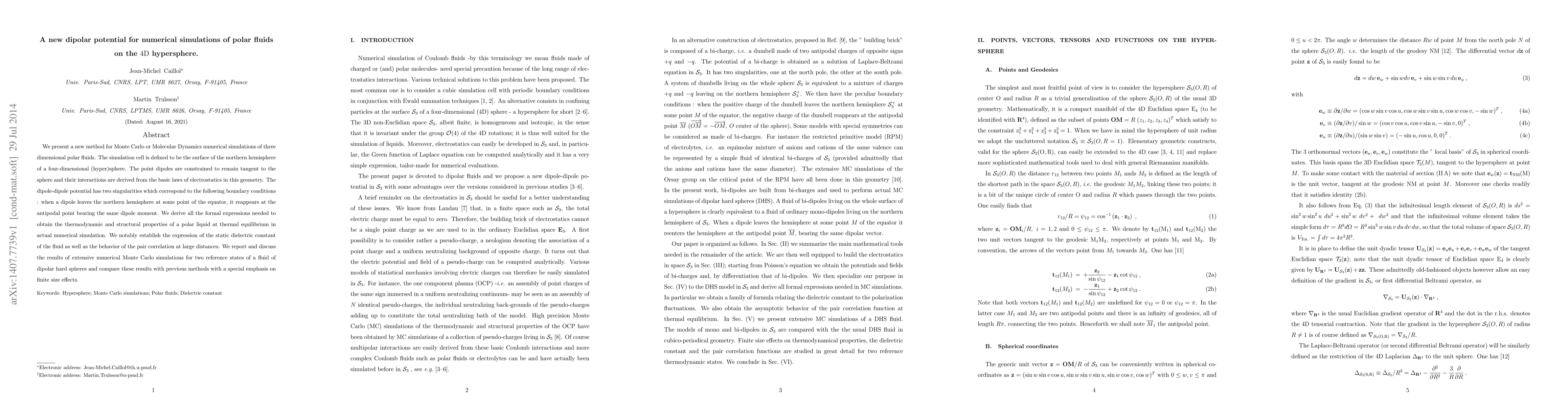 This paper introduces a novel dipolar potential for simulating three-dimensional polar fluids on the surface of a four-dimensional hypersphere, addressing boundary conditions and deriving expressions for thermodynamic properties. Extensive Monte Carlo simulations compare the new method's results with previous approaches, highlighting finite size effects.