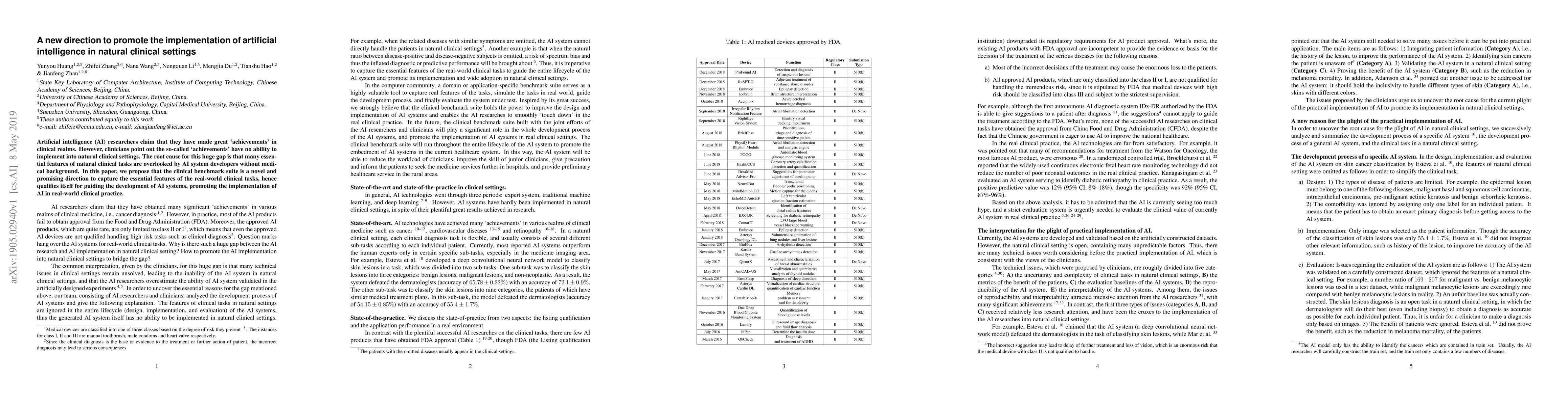 Artificial intelligence (AI) researchers claim that they have made great `achievements' in clinical realms. However, clinicians point out the so-called `achievements' have no ability to implement into natural clinical settings. The root cause for this huge gap is that many essential features of natural clinical tasks are overlooked by AI system developers without medical background. In this paper, we propose that the clinical benchmark suite is a novel and promising direction to capture the essential features of the real-world clinical tasks, hence qualifies itself for guiding the development of AI systems, promoting the implementation of AI in real-world clinical practice.