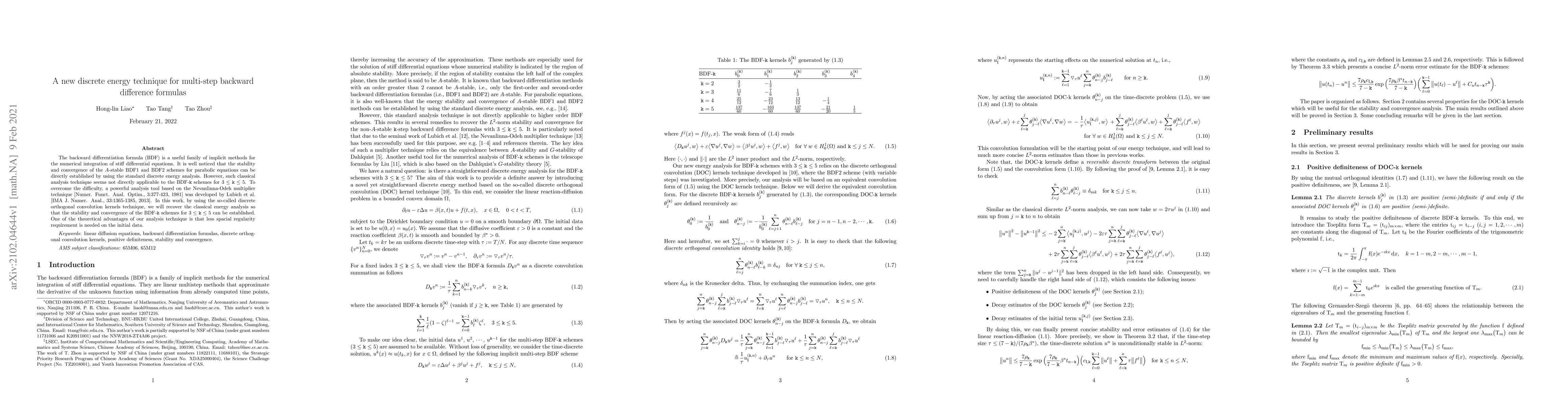 This research introduces a novel discrete energy technique for analyzing the stability and convergence of multi-step backward difference formulas (BDF-k) for k in the range 3 to 5. The methodology leverages discrete orthogonal convolution kernels, allowing for less stringent regularity conditions on initial data compared to previous approaches based on the Nevanlinna-Odeh multiplier technique.