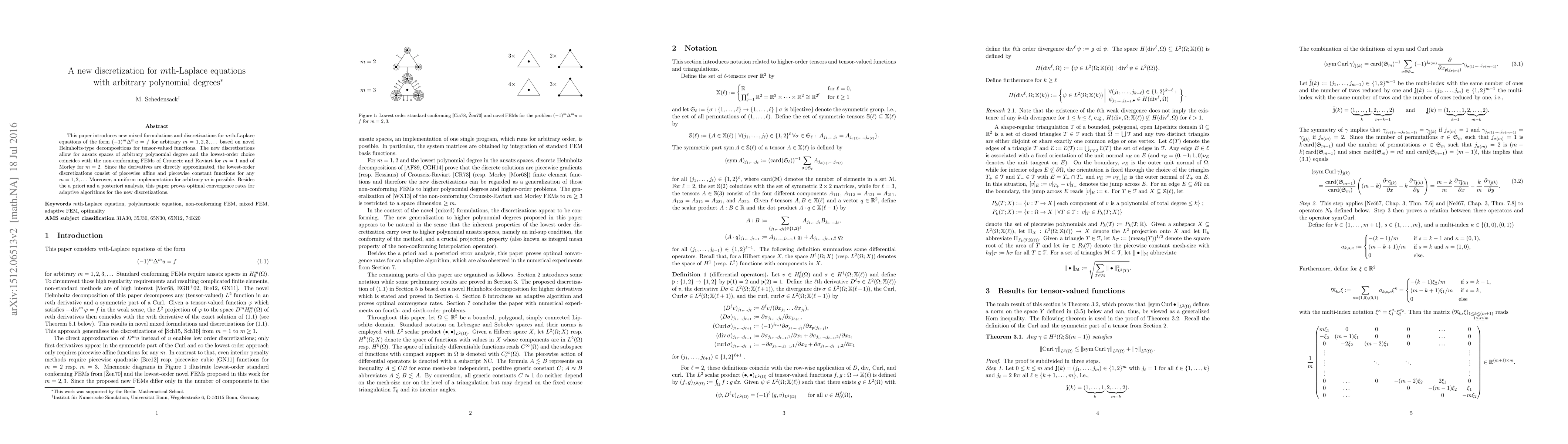 This paper introduces new mixed formulations and discretizations for $m$th-Laplace equations of the form $(-1)^m\Delta^m u=f$ for arbitrary $m=1,2,3,\dots$ based on novel Helmholtz-type decompositions for tensor-valued functions. The new discretizations allow for ansatz spaces of arbitrary polynomial degree and the lowest-order choice coincides with the non-conforming FEMs of Crouzeix and Raviart for $m=1$ and of Morley for $m=2$. Since the derivatives are directly approximated, the lowest-order discretizations consist of piecewise affine and piecewise constant functions for any $m=1,2,\dots$ Moreover, a uniform implementation for arbitrary $m$ is possible. Besides the a priori and a posteriori analysis, this paper proves optimal convergence rates for adaptive algorithms for the new discretizations.