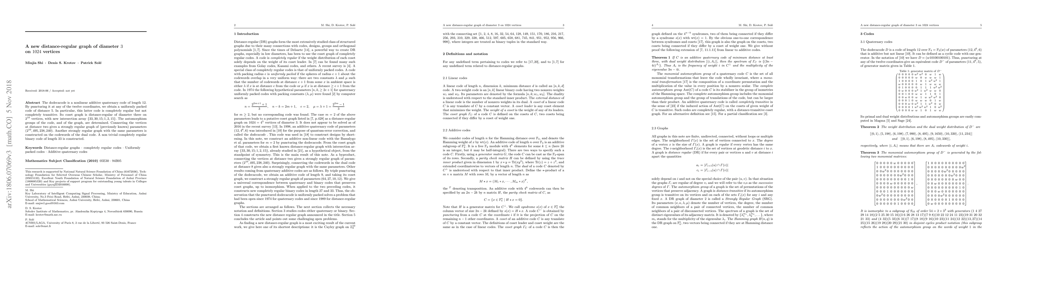 The dodecacode is a nonlinear additive quaternary code of length $12$. By puncturing it at any of the twelve coordinates, we obtain a uniformly packed code of distance $5$. In particular, this latter code is completely regular but not completely transitive. Its coset graph is distance-regular of diameter three on $2^{10}$ vertices, with new intersection array $\{33,30,15;1,2,15\}$. The automorphism groups of the code, and of the graph, are determined. Connecting the vertices at distance two gives a strongly regular graph of (previously known) parameters $(2^{10},495,238,240)$. Another strongly regular graph with the same parameters is constructed on the codewords of the dual code. A non trivial completely regular binary code of length $33$ is constructed.