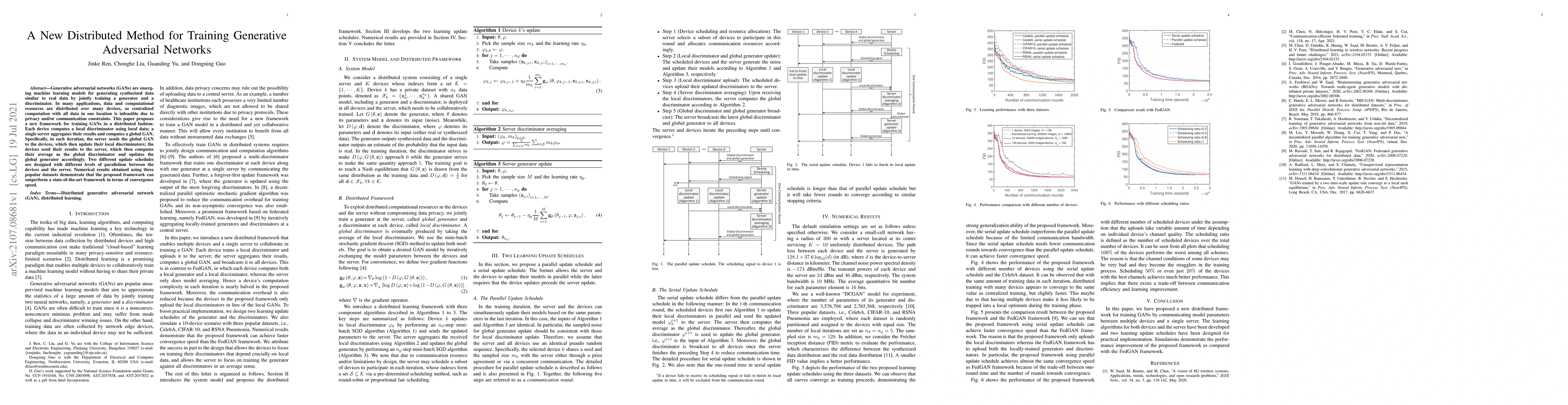 Researchers propose a new framework for training Generative Adversarial Networks (GANs) in a distributed fashion, achieving faster convergence speeds than state-of-the-art methods.