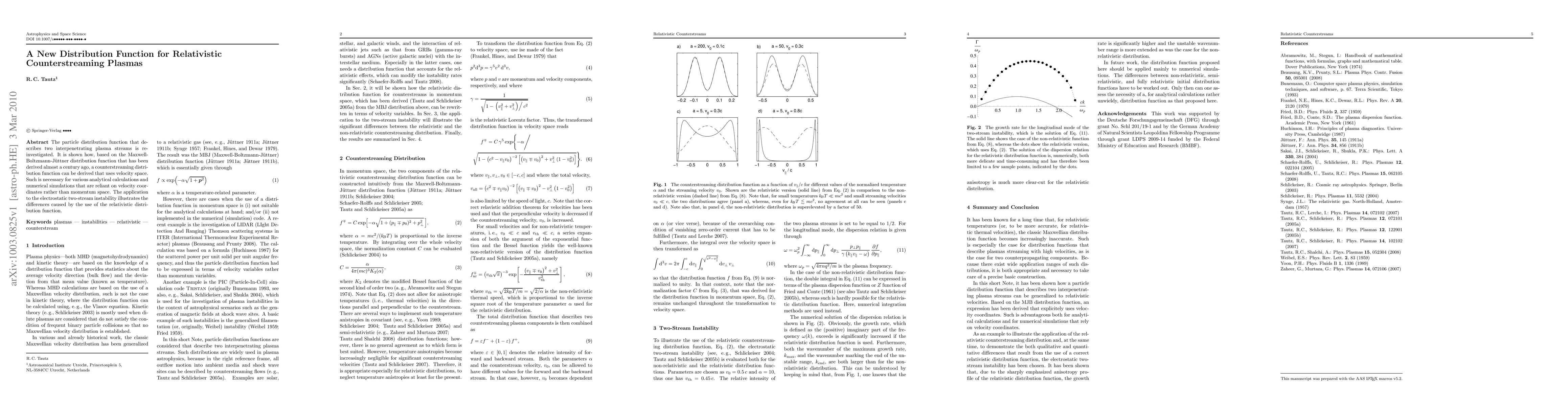 The particle distribution function that describes two interpenetrating plasma streams is re-investigated. It is shown how, based on the Maxwell-Boltzmann-J\"uttner distribution function that has been derived almost a century ago, a counterstreaming distribution function can be derived that uses velocity space. Such is necessary for various analytical calculations and numerical simulations that are reliant on velocity coordinates rather than momentum space. The application to the electrostatic two-stream instability illustrates the differences caused by the use of the relativistic distribution function.