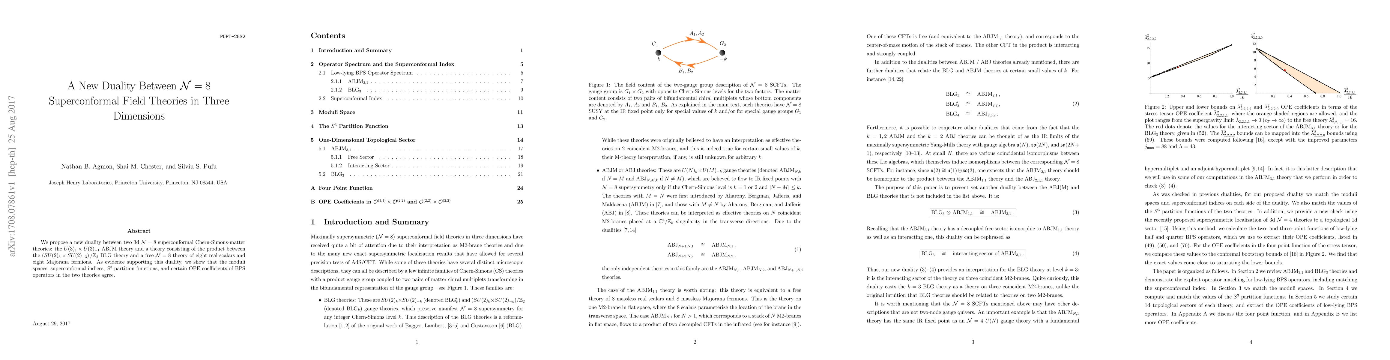 Summary: This paper introduces a novel duality between two 3d $\mathcal{N}=8$ superconformal Chern-Simons-matter theories: the $U(3)_1 \times U(3)_{-1}$ ABJM theory and a combination of the $\left(SU(2)_3\times SU(2)_{-3}\right)/\mathbb{Z}_2$ BLG theory and a free $\mathcal{N}=8$ scalar-fermion theory, supported by matching moduli spaces, indices, partition functions, and OPE coefficients.