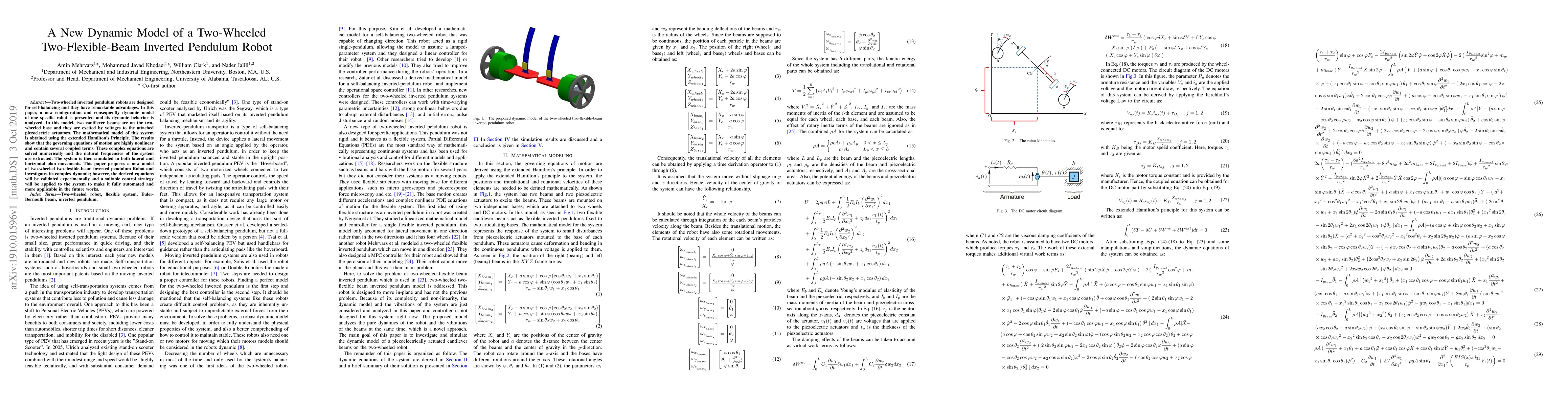 This paper introduces a new configuration for a two-wheeled inverted pendulum robot utilizing two flexible cantilever beams with piezoelectric actuators, modeled using extended Hamilton's Principle. The derived nonlinear dynamic equations are solved numerically, and the system's complex behavior is simulated for lateral and horizontal movements.
